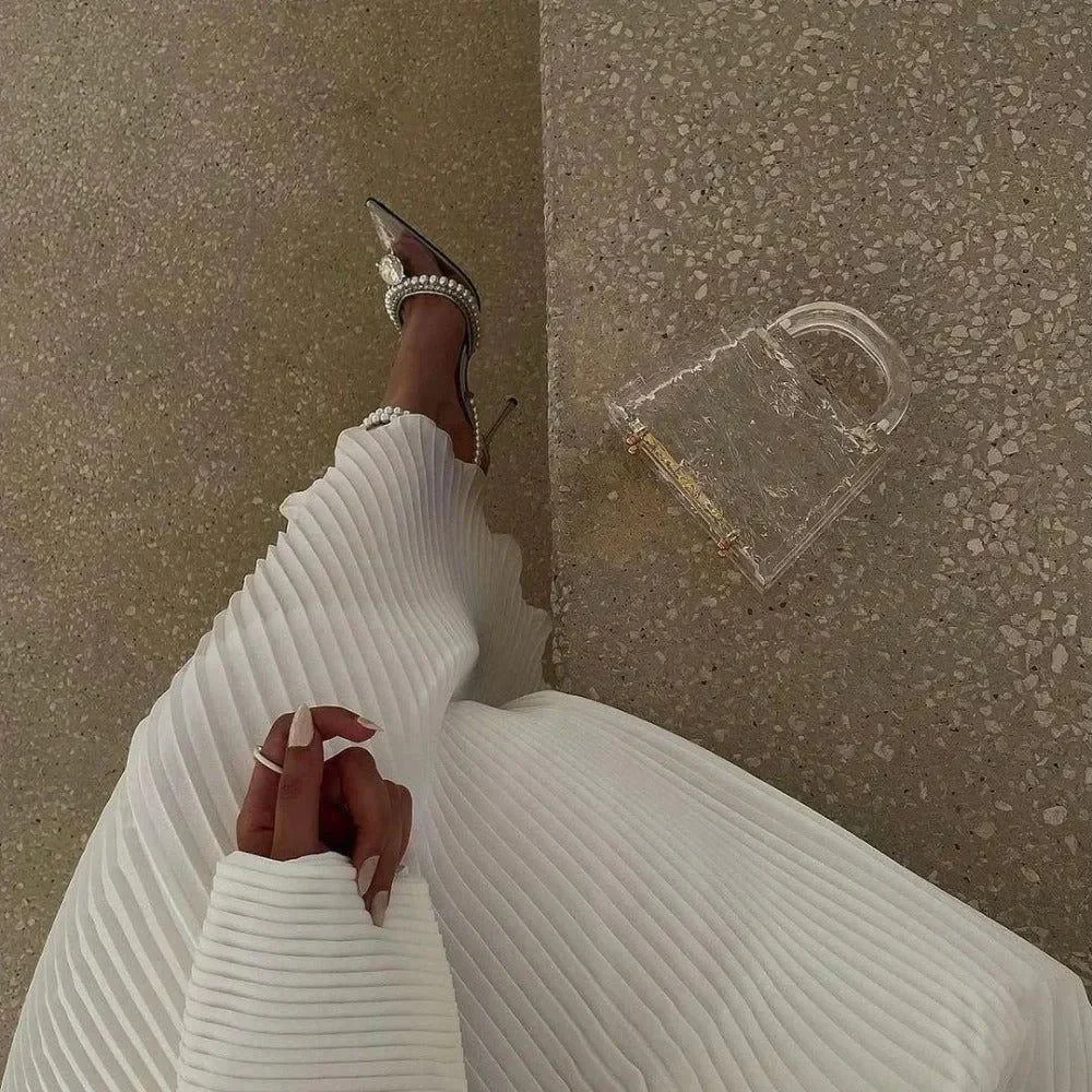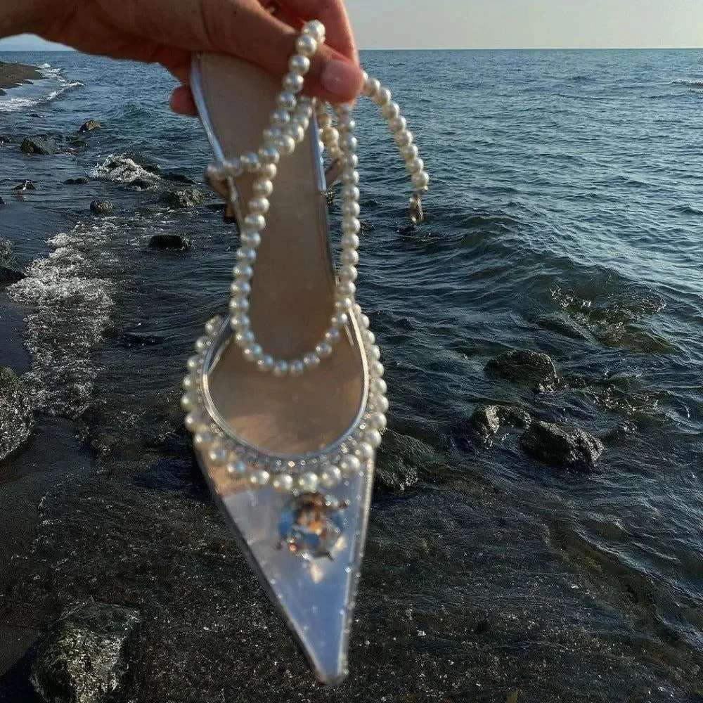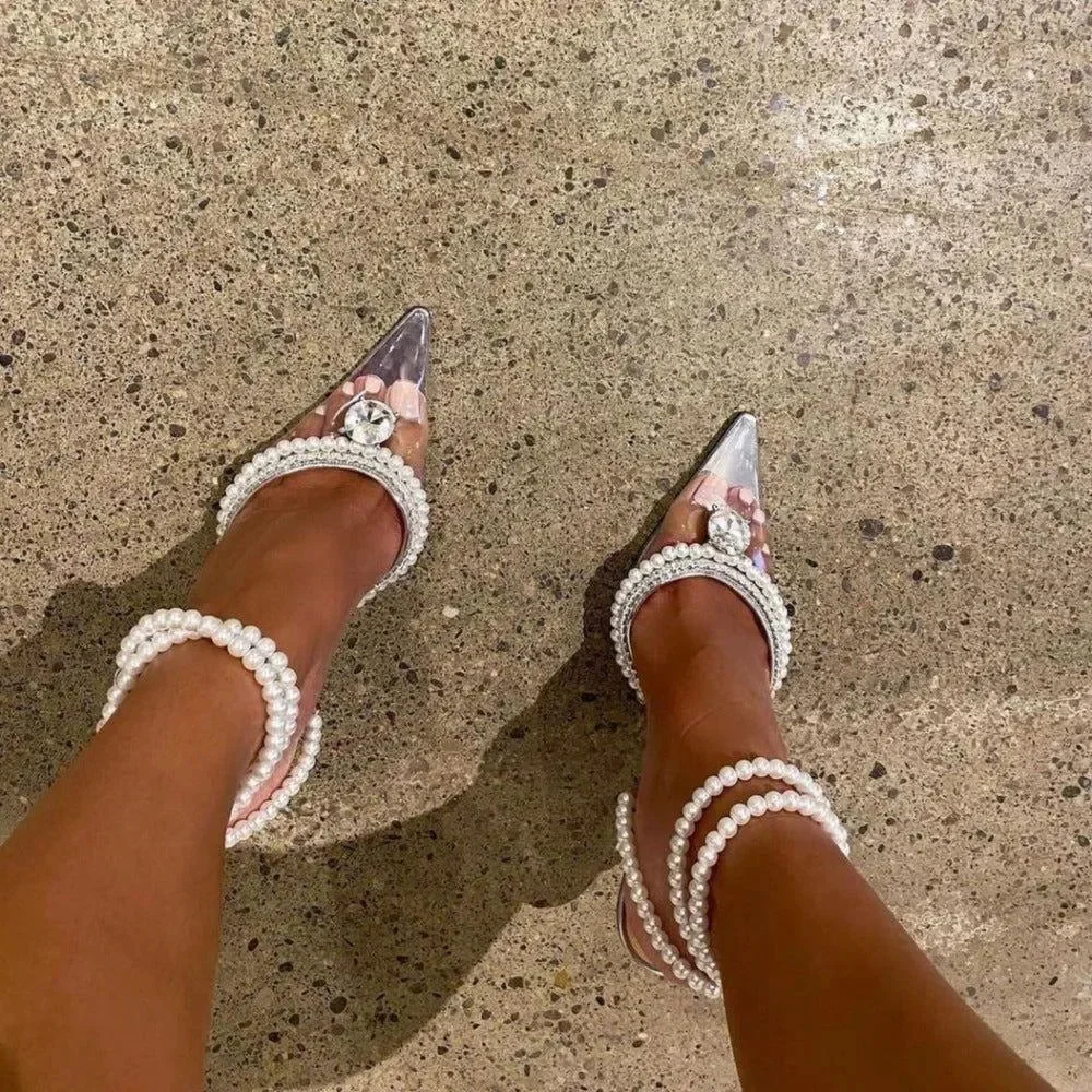 Elevate your style with these Elegant Pearl Strap Clear Heels. Featuring a stunning pearl strap and crystal clear design, these heels are perfect for special events. The transparent material beautifully accentuates your outfit, while the pearl embellishments exude sophistication. With a comfortable 3.5-inch stiletto heel and adjustable strap for a secure fit, these heels are ideal for all-day wear. Be the epitome of elegance and class at any evening affair. Explore more fashion tips on Instagram @mermaid_way.