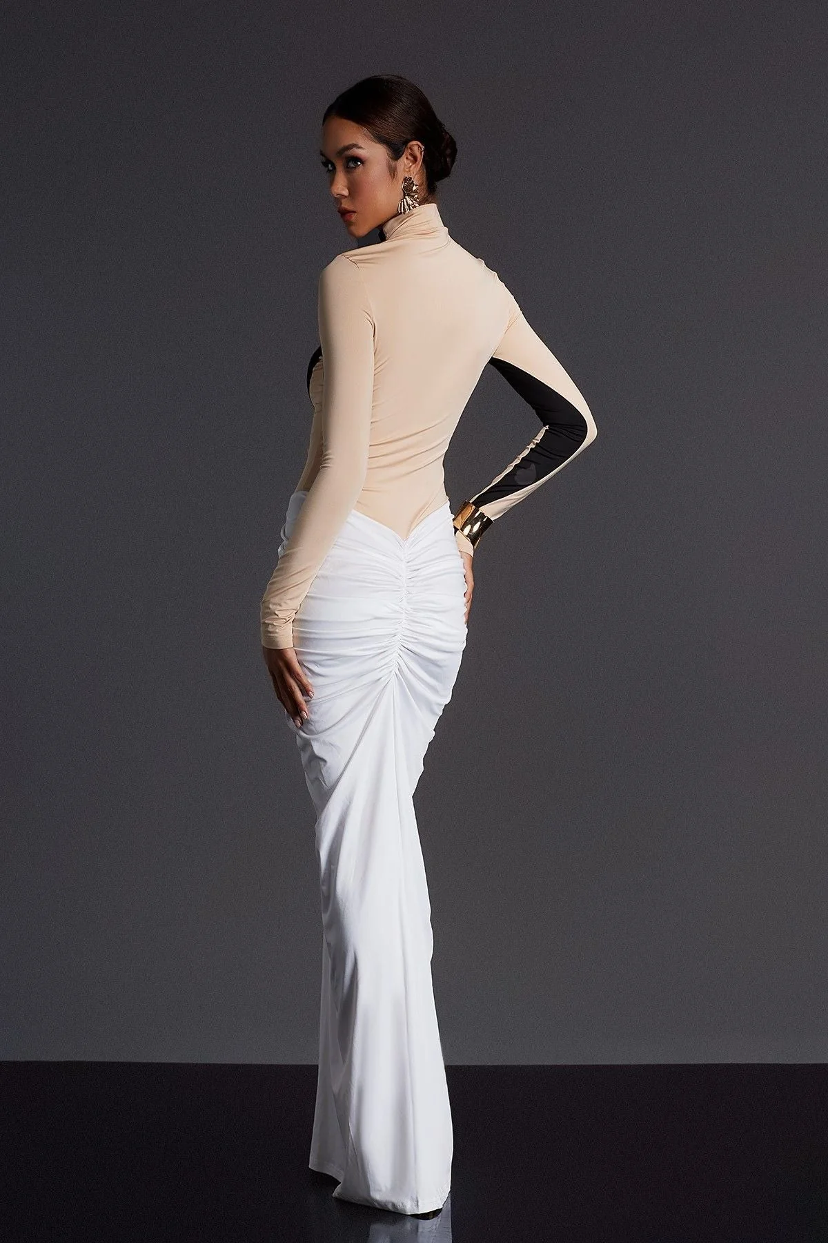 Elevate your wardrobe with the effortlessly elegant Ruched Split Maxi Dress. Perfect for any occasion, this dress features billowing long sleeves, a split maxi skirt, and a flattering ruched design that suits any body type. Made with 100% Polyester for slight stretch. Dry clean only. Color may vary due to lighting. Model is wearing size S. Discover unparalleled style and comfort with this must-have dress!