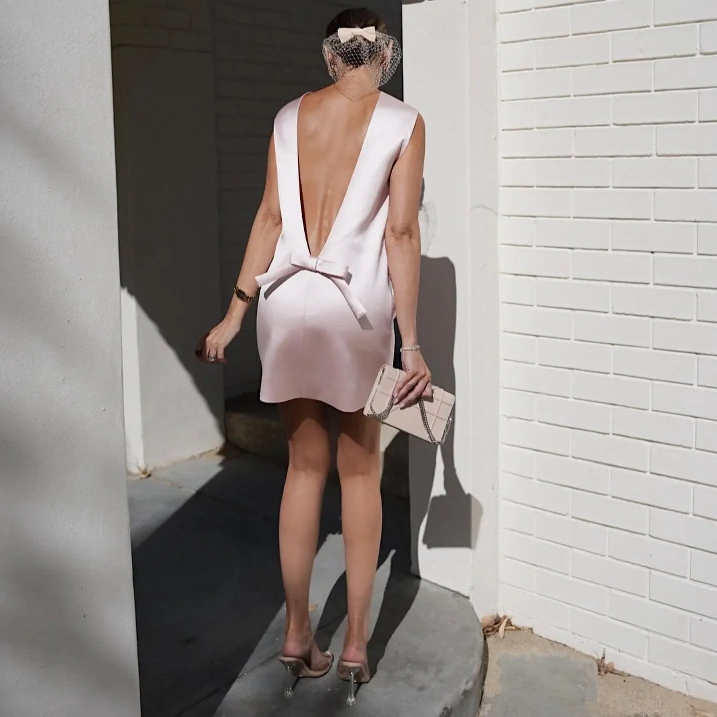 Indulge in luxury with our Elegant Satin Bow Backless Mini Dress. This exquisite piece features a charming bow detail at the back, enhancing your elegance effortlessly. Made from a lavish satin blend of 55% polyester and 45% rayon, this dress drapes gracefully, accentuating your silhouette flawlessly. The chic backless design is perfect for showcasing your favorite accessories, making it ideal for special occasions. Fully lined for comfort, this dress combines style and sophistication seamlessly. Experience the smoothness of satin and elevate your style game with this timeless piece.