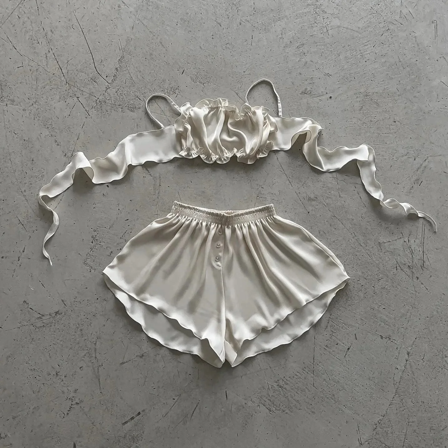 Elevate your evening wardrobe with this elegant satin crop top and ruched mini skirt set. Crafted from luxurious silky fabric, these pieces offer a graceful drape and a refined silhouette. Designed for style and comfort, ensure you remain fashionable throughout your evening. This striking ensemble adds boldness to any occasion, be it a party, special event, or dinner outing. Complete your look with our oversized bow satin slippers. For more styling inspiration, visit our Instagram @mermaid_way. Enjoy a complimentary exchange if sizing doesn’t fit.