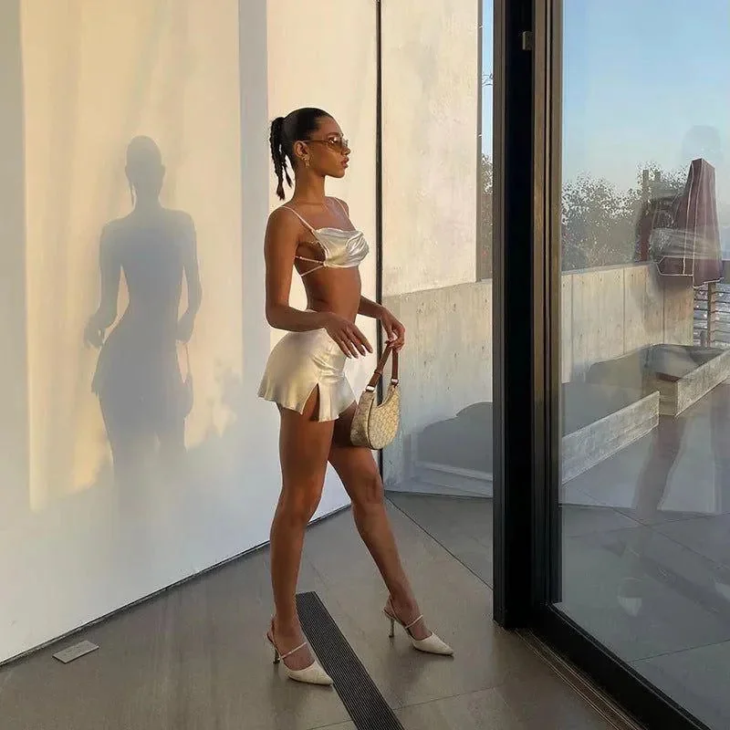Elevate your wardrobe with this elegant matching set in white. The set includes a chic fitted crop top and high-waisted pants, perfect for various occasions. Made of soft and stretchy fabric, it offers exceptional comfort and a flattering fit. Whether for casual outings or special events, this set effortlessly adapts to your style. Blend elegance with practicality with this standout choice for chic contemporary looks all season long. Experience effortless elegance with the Milana Satin Two-Piece Set available for quick exchanges in case of fit issues. Find more fashion inspiration on Instagram @mermaid_way.