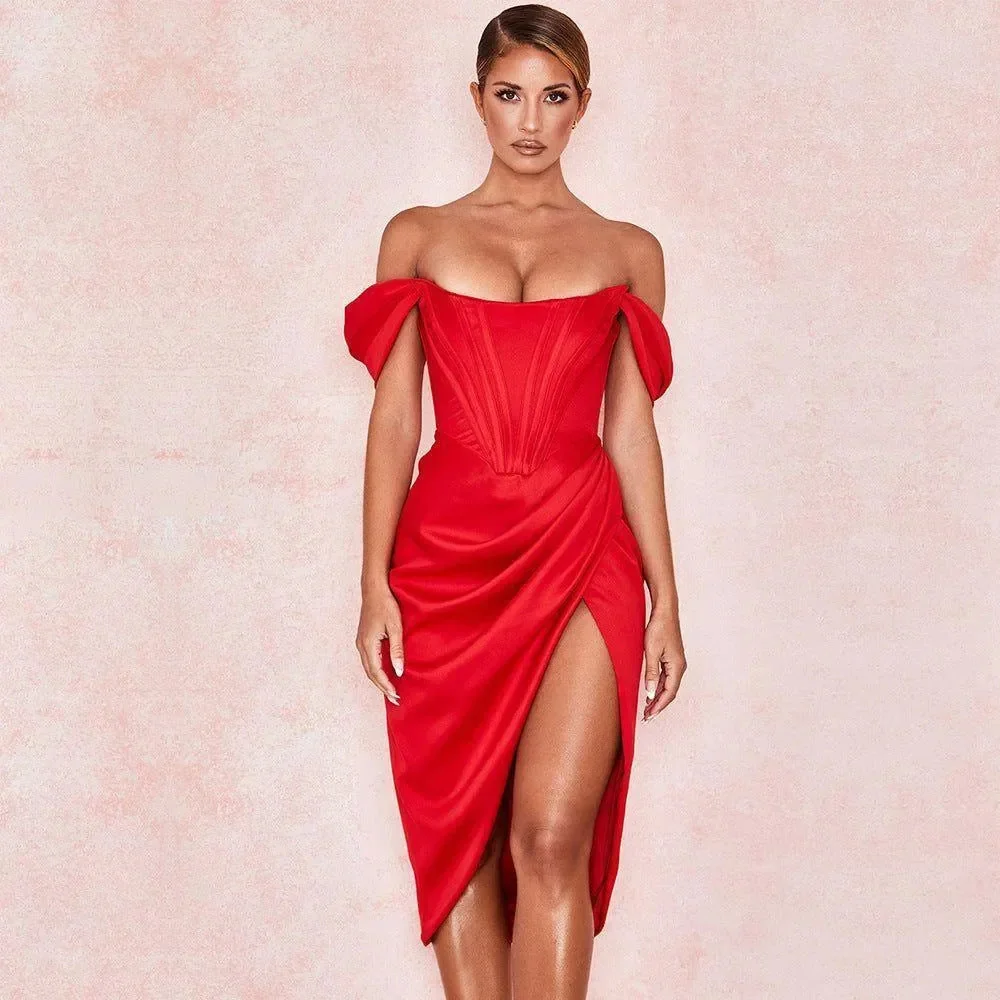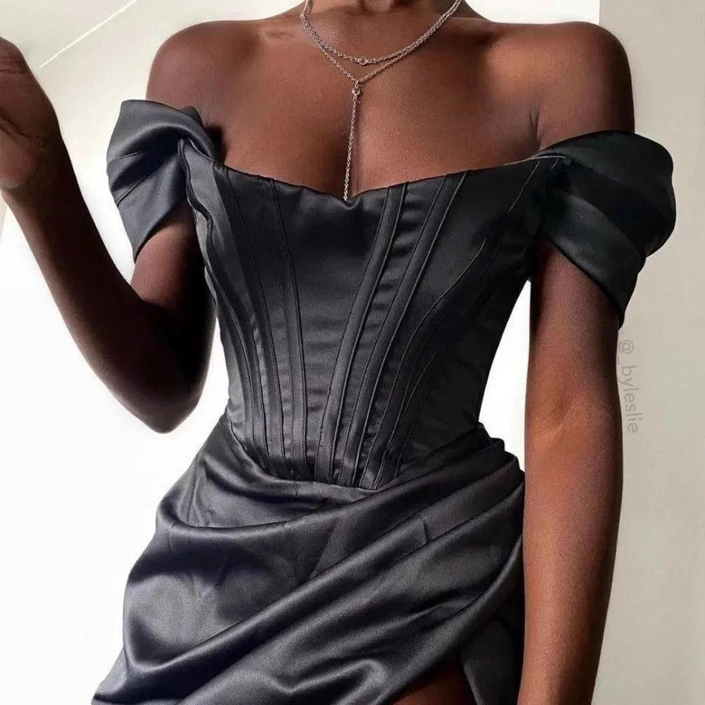 Indulge in elegance with our exquisite off-shoulder dress made from high-quality satin. This sophisticated piece boasts a fitted bodice for a refined silhouette and an off-shoulder neckline that exudes timeless charm. The luxurious fabric drapes beautifully for a flattering fit that enhances your natural grace. Pair it with stylish wrap-around heels for a polished ensemble perfect for any special occasion. Elevate your wardrobe with this versatile dress that promises to leave a lasting impression wherever you go.