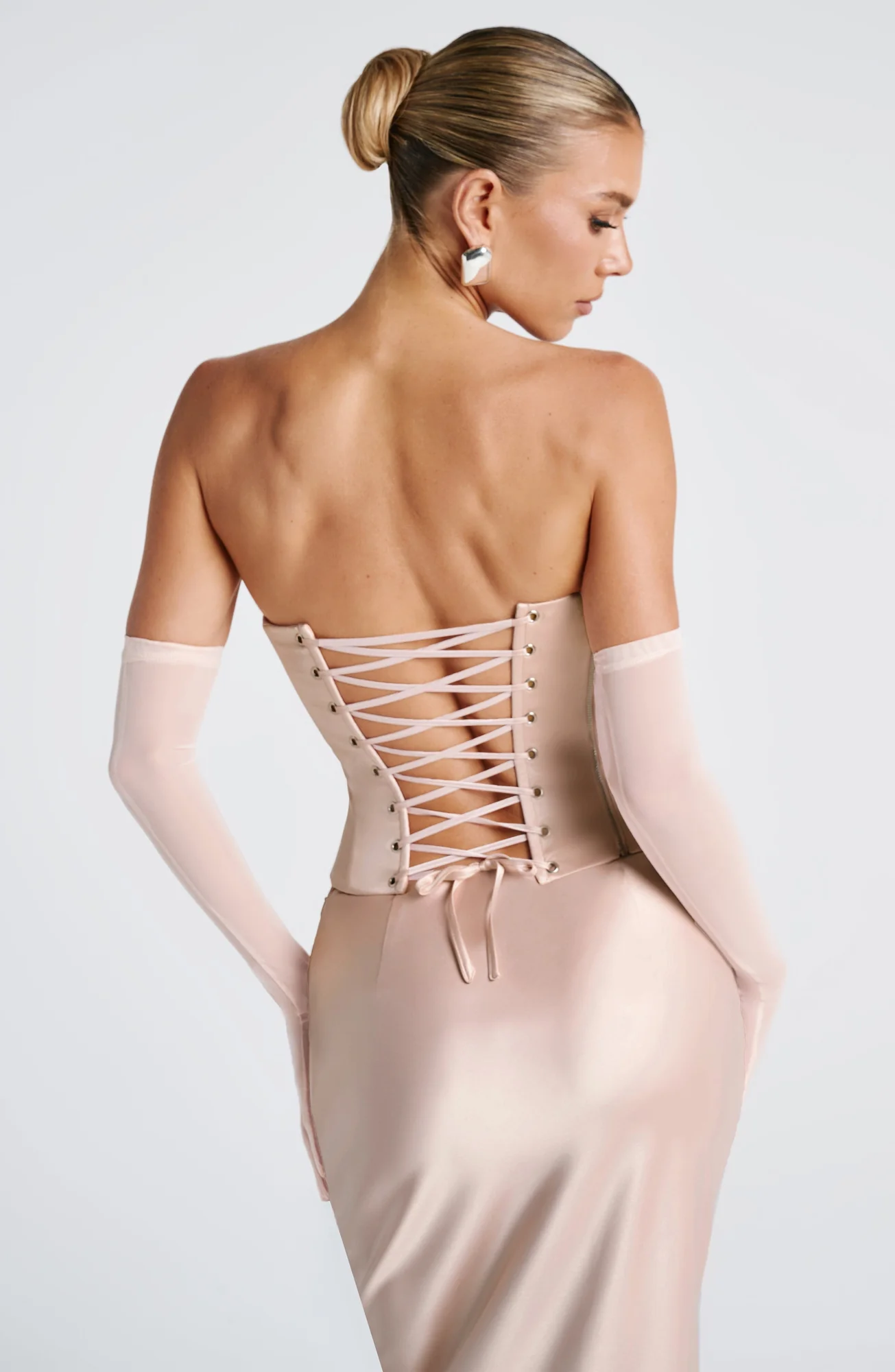 Indulge in the sophistication of the Callista Corset in Soft Peach. This strapless top features a pleated cowl neckline, sculpting boned bodice, and lace-up back for a perfect fit. The longline design with a shaped hem exudes femininity, pairing flawlessly with the Eli Gloves, Ayla Scarf, and Bernadette Skirt. Elevate your style with this dreamy look made of stretch satin, fully lined for comfort. Available in sizes XS to XXL.