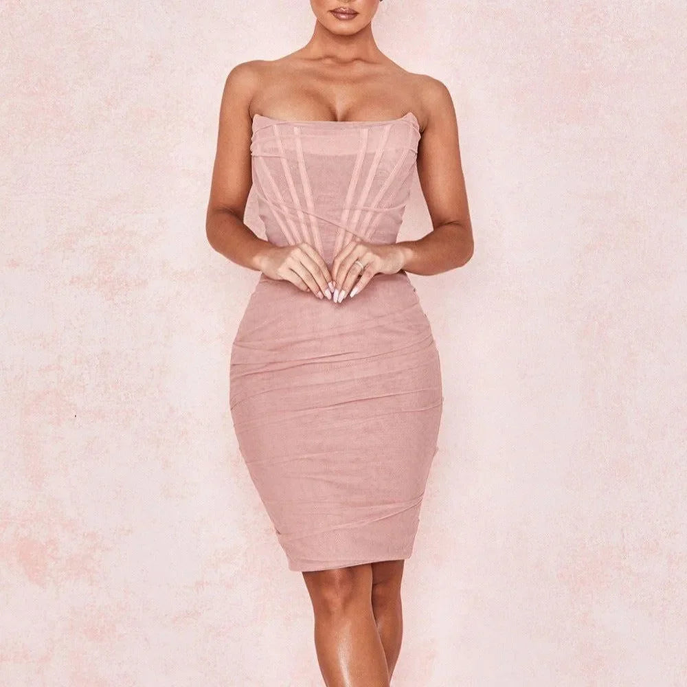 Make a statement with our Strapless Corset Midi Dress in Pink, Ivory, or Black. This sophisticated dress features a structured corset top that enhances your silhouette elegantly. The midi length exudes charm, perfect for special events. Crafted from a blend of chiffon, satin, and spandex, it offers a luxurious fit that supports you with style. Stand out at any upscale gathering effortlessly. Discover new fashion trends with our chic Strapless Corset Midi Dress. Free size exchange available.