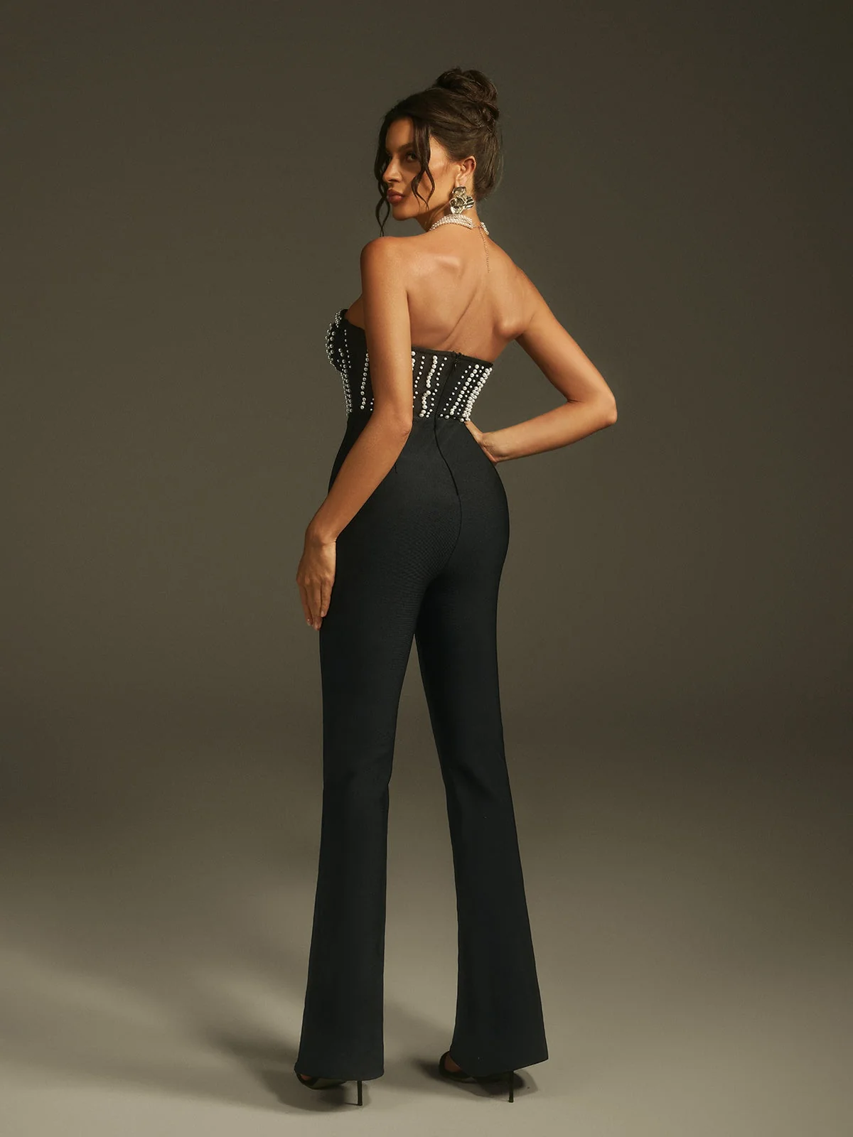 Elevate your style with the Elegant Strapless Pearl Bandage Jumpsuit. This stylish jumpsuit is designed to hug your curves flawlessly, featuring a chic strapless neckline and delicate pearl accents that add a touch of sophistication. Whether its a special occasion or a night out, this jumpsuit offers both comfort and confidence with its bandage fit. Stand out with this sophisticated and flattering piece that includes an invisible zipper opening at the back. The high stretch factor ensures a comfortable fit. Dry clean only. Please note, color may vary due to lighting. Model is wearing size S.