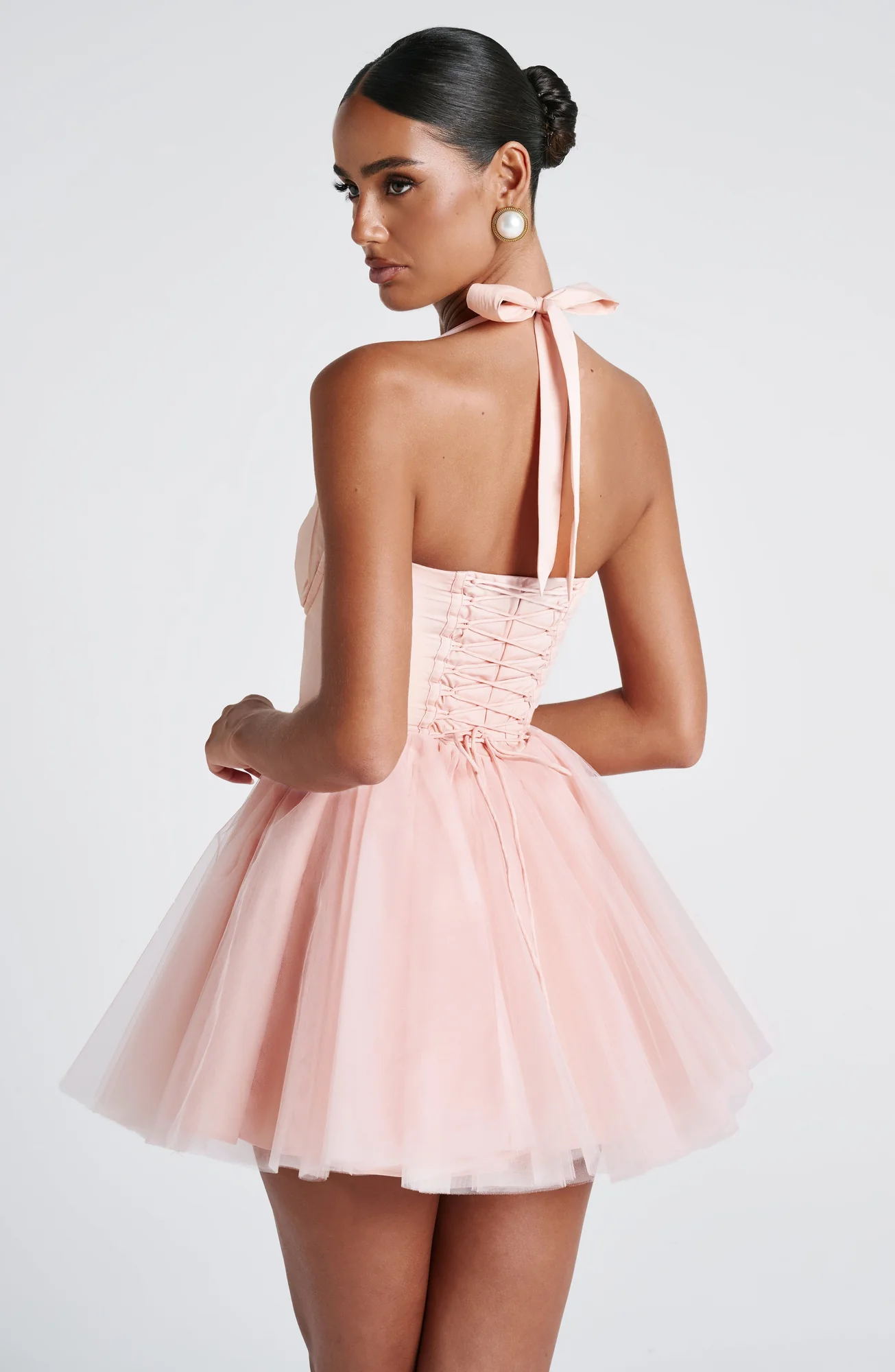 Make a statement with our Elegant Sweetheart Neckline Mini Dress in Soft Peach. This exquisite dress features underwired cups with pleating, a lace-up back for a tailored fit, and a tulle skirt for a playful touch. Perfect for special occasions, the dress is crafted from cotton, nylon, and elastane voile fabric for a luxurious feel and is fully lined for comfort. The corset overlay and boning in the bodice offer a flattering silhouette, making you stand out effortlessly. Embrace fairy-tale charm with a modern twist! Color: Soft Peach. Length: Mini. Ideal for birthdays, parties, and more.