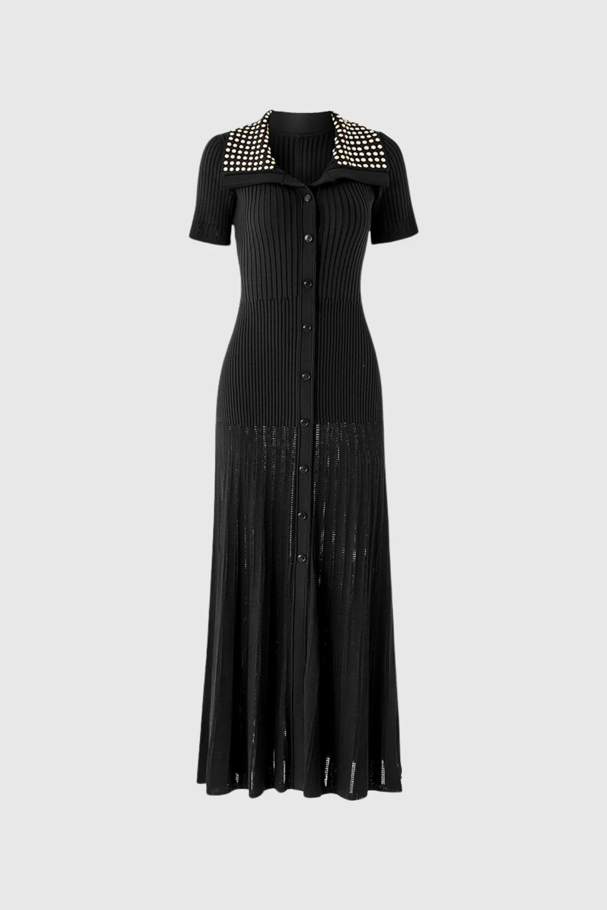 Indulge in the sophisticated elegance of the Embellished Lapel Knit Maxi Dress. Crafted for both style and comfort with stunning embellishments and a flattering knit fabric blend of 50% Polyester and 50% Cotton. This versatile dress is perfect for any occasion and ensures a comfortable and fashionable look. The slight stretch enhances the fit, making it a chic essential for the fashion-forward individual. Embrace true elegance with this black maxi dress. Gentle machine wash recommended.