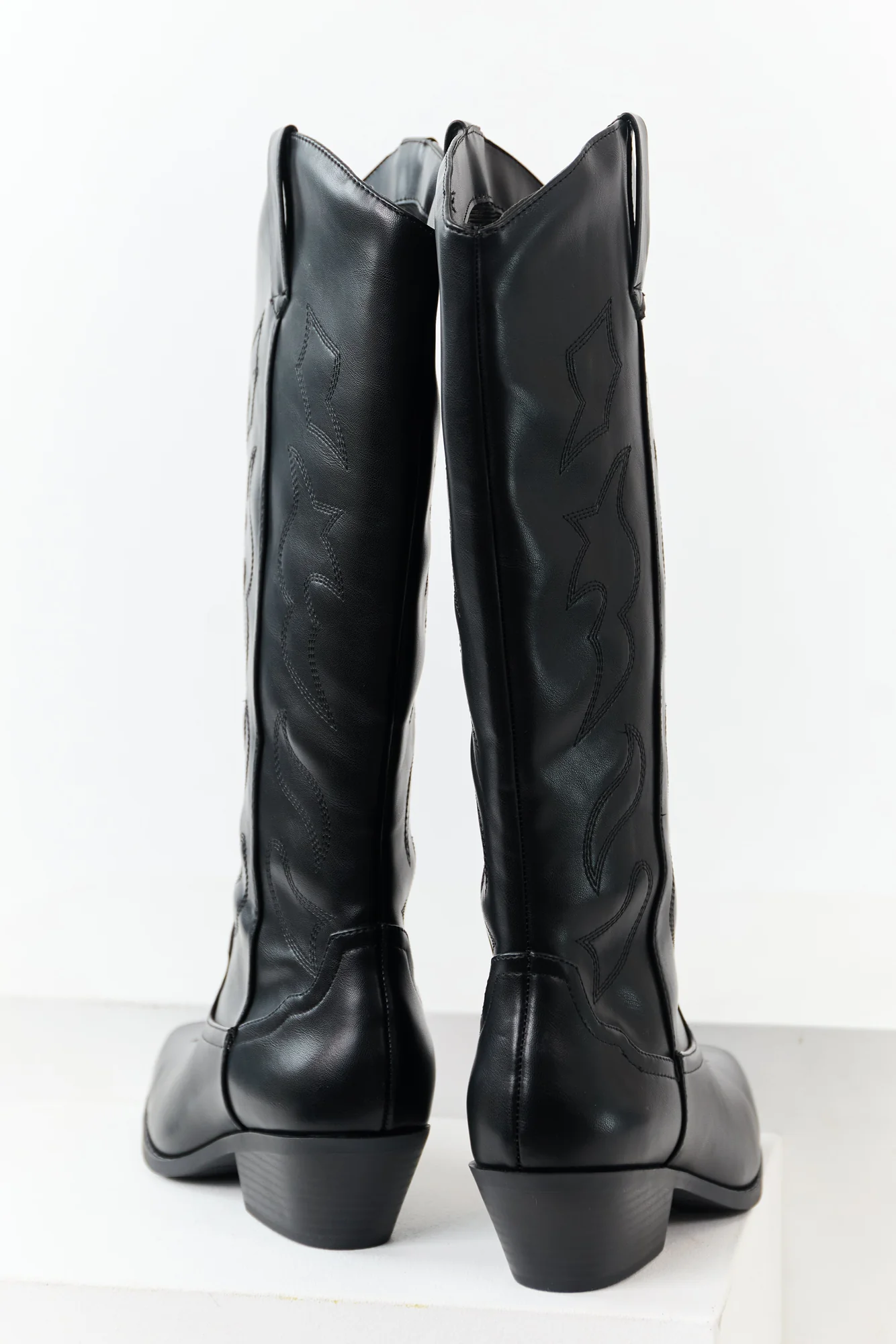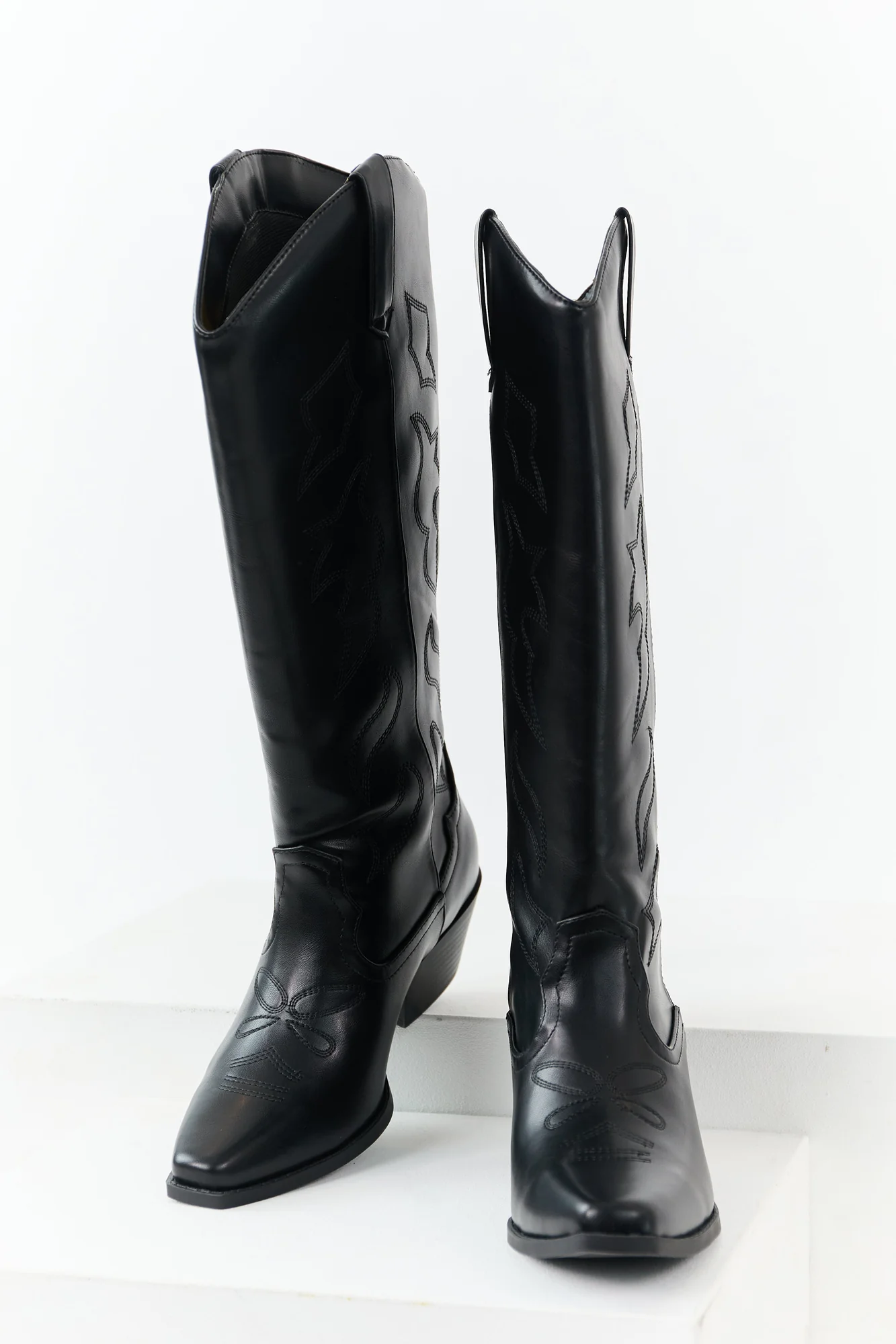 Step out in style with these stunning Western-inspired boots. Crafted from non-stretchy faux leather with intricate embroidery, these tall boots feature a low stack heel, side pull tabs, and a curved opening. With a shaft height of 16 inches, circumference of 17 inches, and a 2.25-inch heel, these imported boots exude elegance and sophistication. Available in sizes 5.5 to 11.
