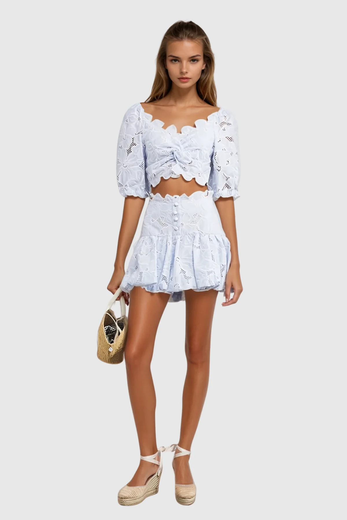 Elevate your wardrobe with the Embroidered Cutout Skirt Set , expertly crafted to blend intricate embroidery with modern cutout detailing. This set offers a sophisticated silhouette highlighting craftsmanship and style, perfect for refined elegance. The delicate embroidery enhances texture and visual interest, while cutouts provide a contemporary edge. Ideal for fashion connoisseurs seeking both tradition and trend. Non-stretch material. Clean with gentle machine wash. Color variations due to lighting. Add this chic essential to your collection today!