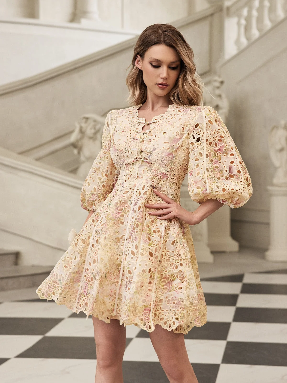 Elevate your style with our Embroidered Puff Sleeve Mini Dress, blending delicate charm with modern flair. The puff sleeves add romantic volume, while intricate embroidery brings elegance and texture. Whether for standout events or everyday elegance, this dress offers a flattering silhouette that boosts confidence effortlessly. Revel in comfort and sophistication with every wear. Crafted from 100% Polyester with a slight stretch, featuring a zippered back opening. Dry clean only. Model is wearing size S.
