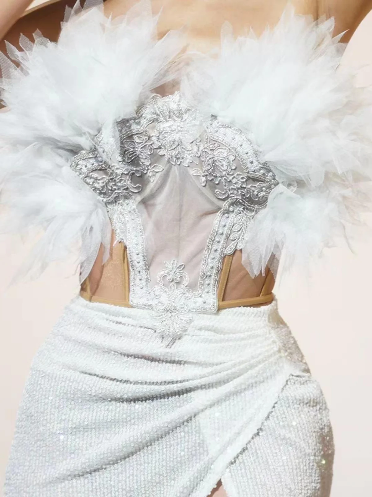 Elevate your style with our stunning Embroidered Ruched White Skirt Set for women. This set features intricate embroidery, a flattering ruched skirt, and comfortable non-stretch polyester fabric. Suitable for all occasions, it offers both elegance and comfort. Dry clean only. Please note: Color may vary slightly. Feel confident and stylish in this versatile outfit. Model is wearing size S.