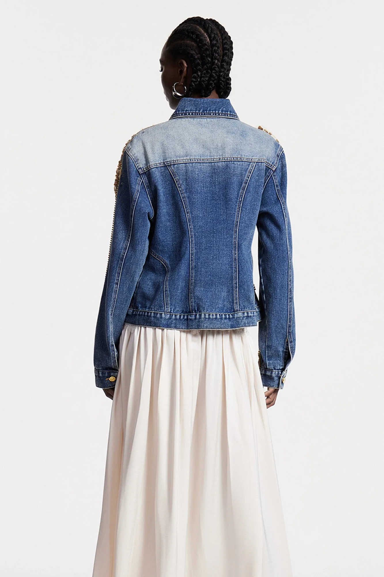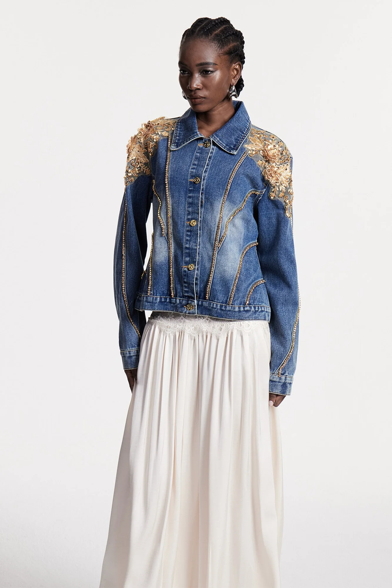 Elevate your wardrobe with the Embroidered Sequin Denim Jacket , a sophisticated blend of durable denim, intricate embroidery, and subtle sequin embellishments. This jacket strikes the perfect balance between toughness and elegance, making it a statement piece suitable for expert-level curation. The detailed craftsmanship enhances any outfit, providing a classy yet edgy look. Its textured embellishments catch the light, adding a touch of glamour to the classic denim structure. Whether dressed up or down, this stylish jacket is a versatile addition to your collection. Color variations may occur due to lighting. Machine wash cold for easy care.