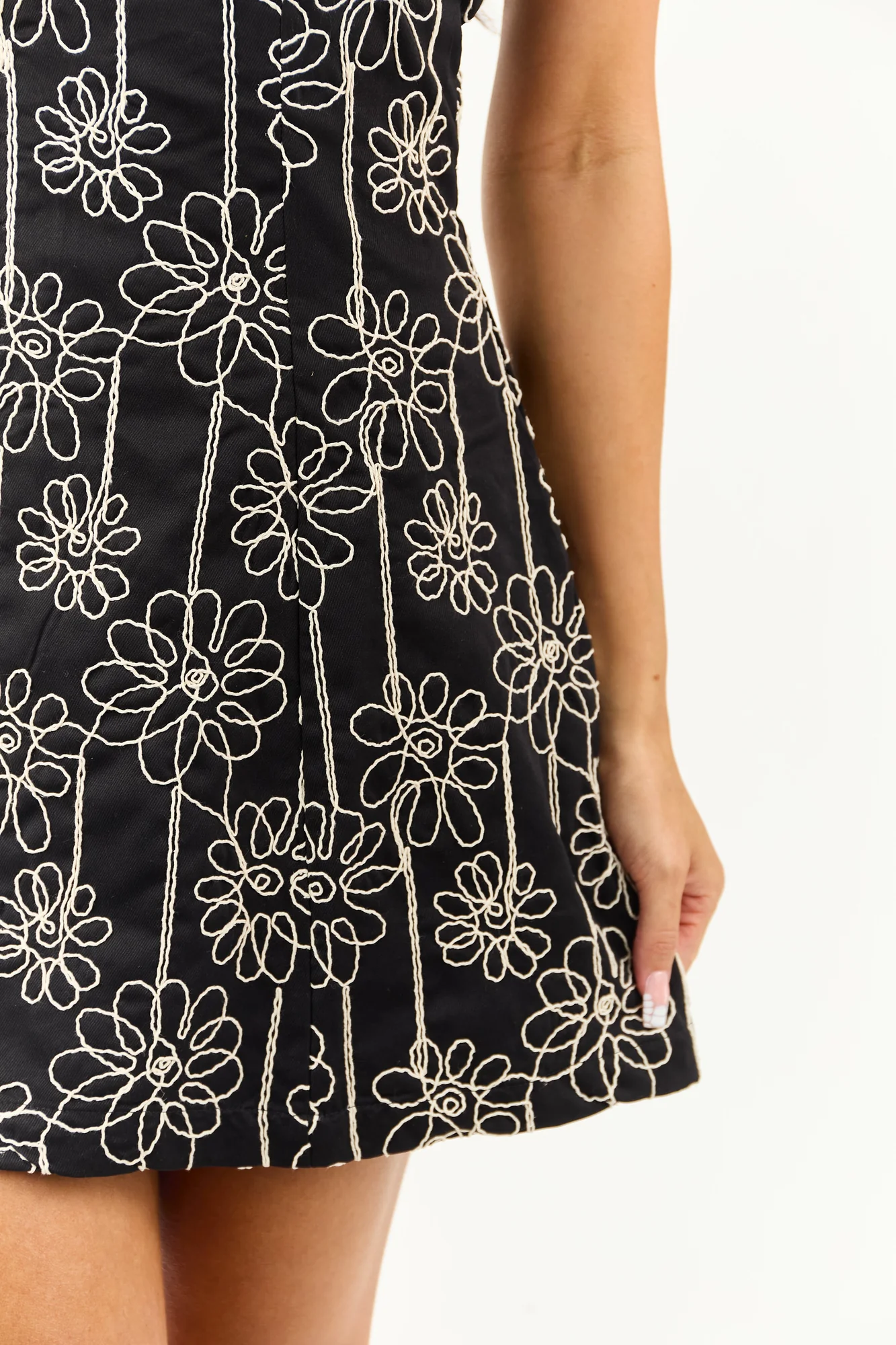 This stunning black mini dress features raised floral embroidery in a luxurious A-line silhouette. Made from 100% polyester, it combines romance with sophistication. The dress comes with adjustable spaghetti straps, a hidden back zipper, and an adhesive bust strip for a perfect fit. Stay elegant and comfortable all day long with this lined dress. Model is wearing size Small. Size Chart: XS (Size 0/2), S (Size 4/6), M (Size 8/10), L (Size 12/14), XL (Size 16/18). Bust: XS (31-32), S (33-34), M (35-36), L (37-38), XL (39-40). Waist: XS (23-24), S (25-26), M (27-28), L (29-30), XL (31-32). Length: 31