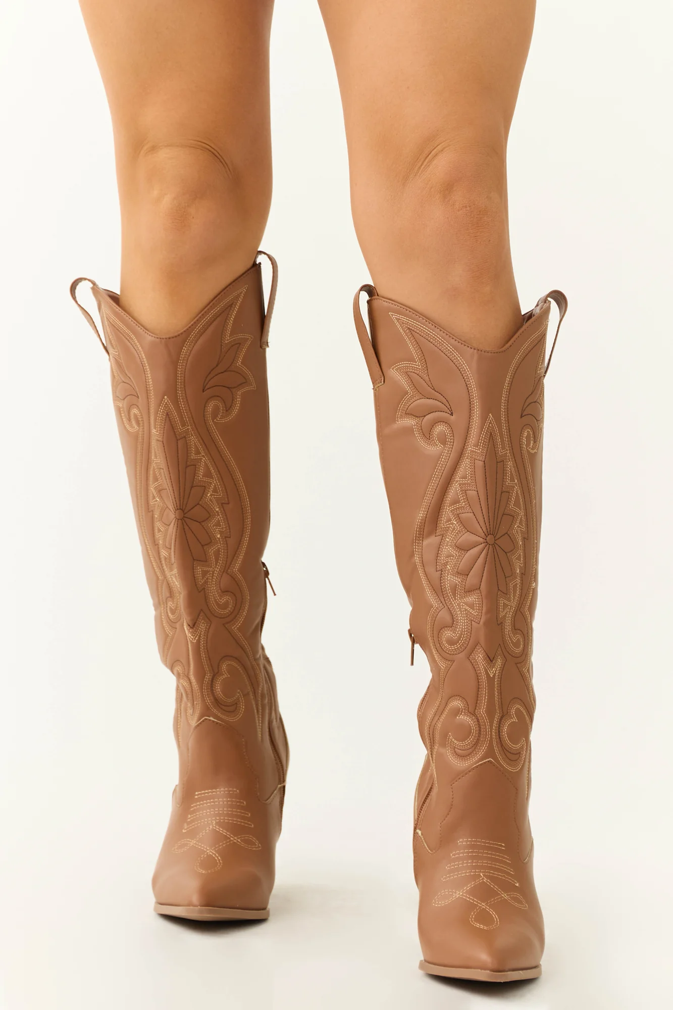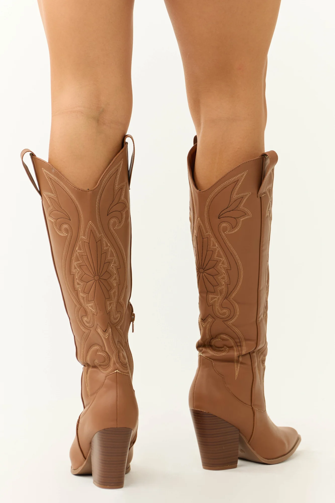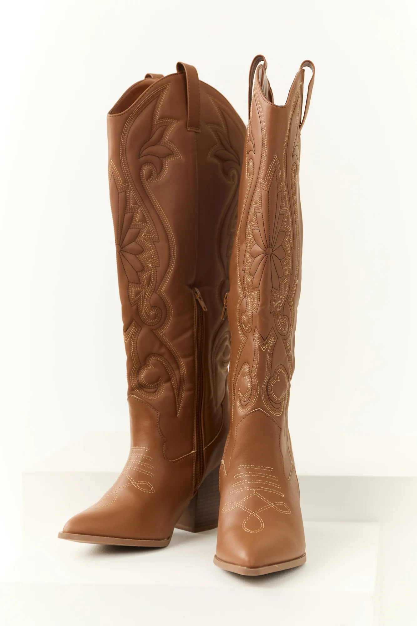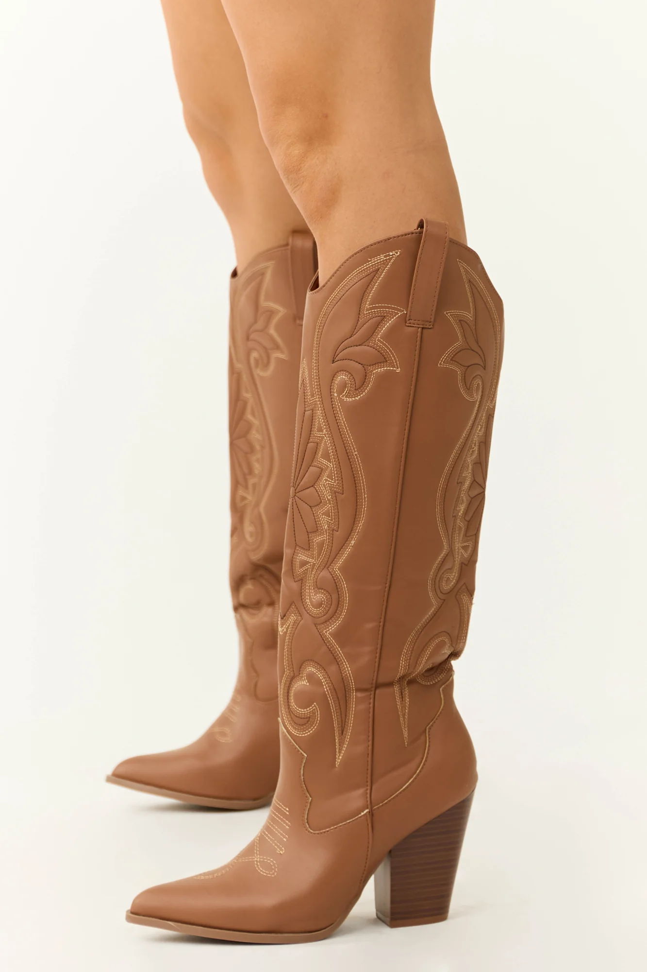 Step out in style with these stunning knee-high boots in Cognac Brown featuring exquisite embroidering in Sepia, Black, and Camel shades. Crafted from faux leather with a stacked heel, pointed toe, pull-on tabs, and zipper closure. Shaft height measures 17 inches with a 15-inch circumference. Heel height is approximately 3.75 inches. Imported.