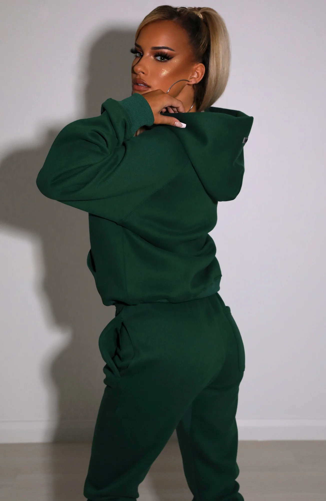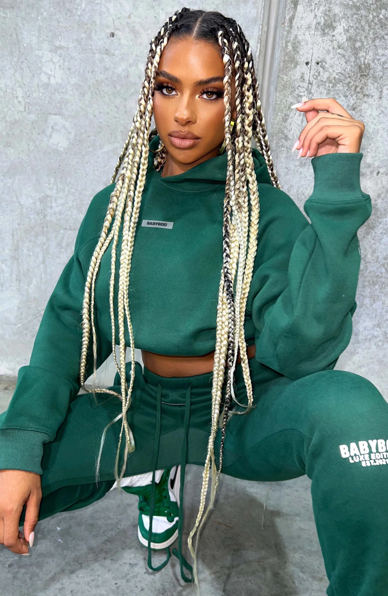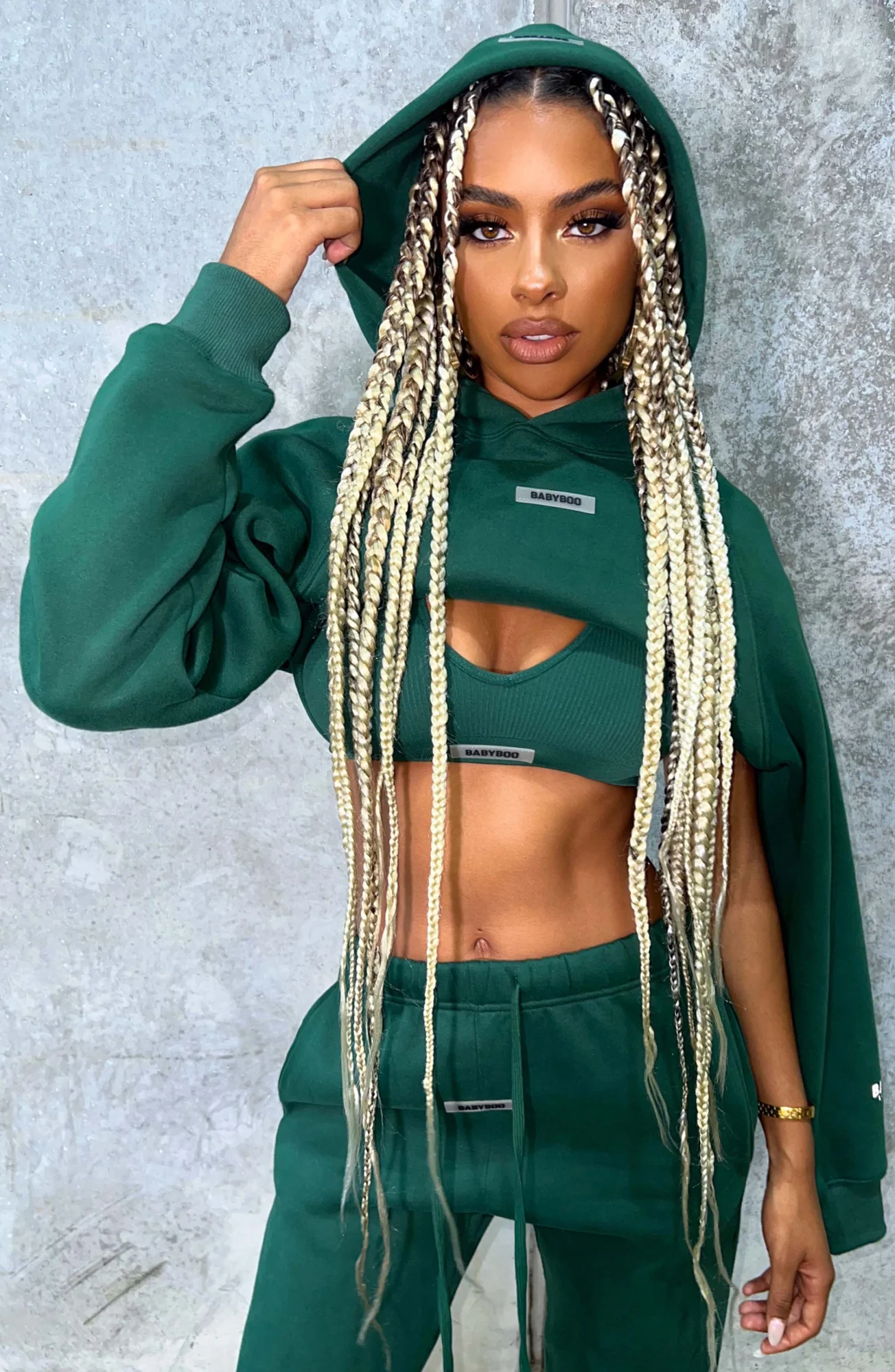 The Emerald Cotton Fleece Hoodie features a functional front pocket, ribbed cuffs, and hem. Stay cozy in style with the Babyboo logo on the chest, hood, and sleeve. This hoodie is made of Cotton Fleece material, ensuring a comfortable and fashionable look. The over-sized fit complements your unique style effortlessly. Model is wearing a size XS. This hoodie is a must-have for a chic and comfortable look in all seasons.