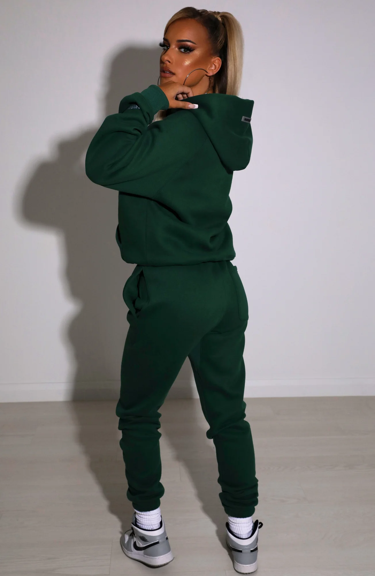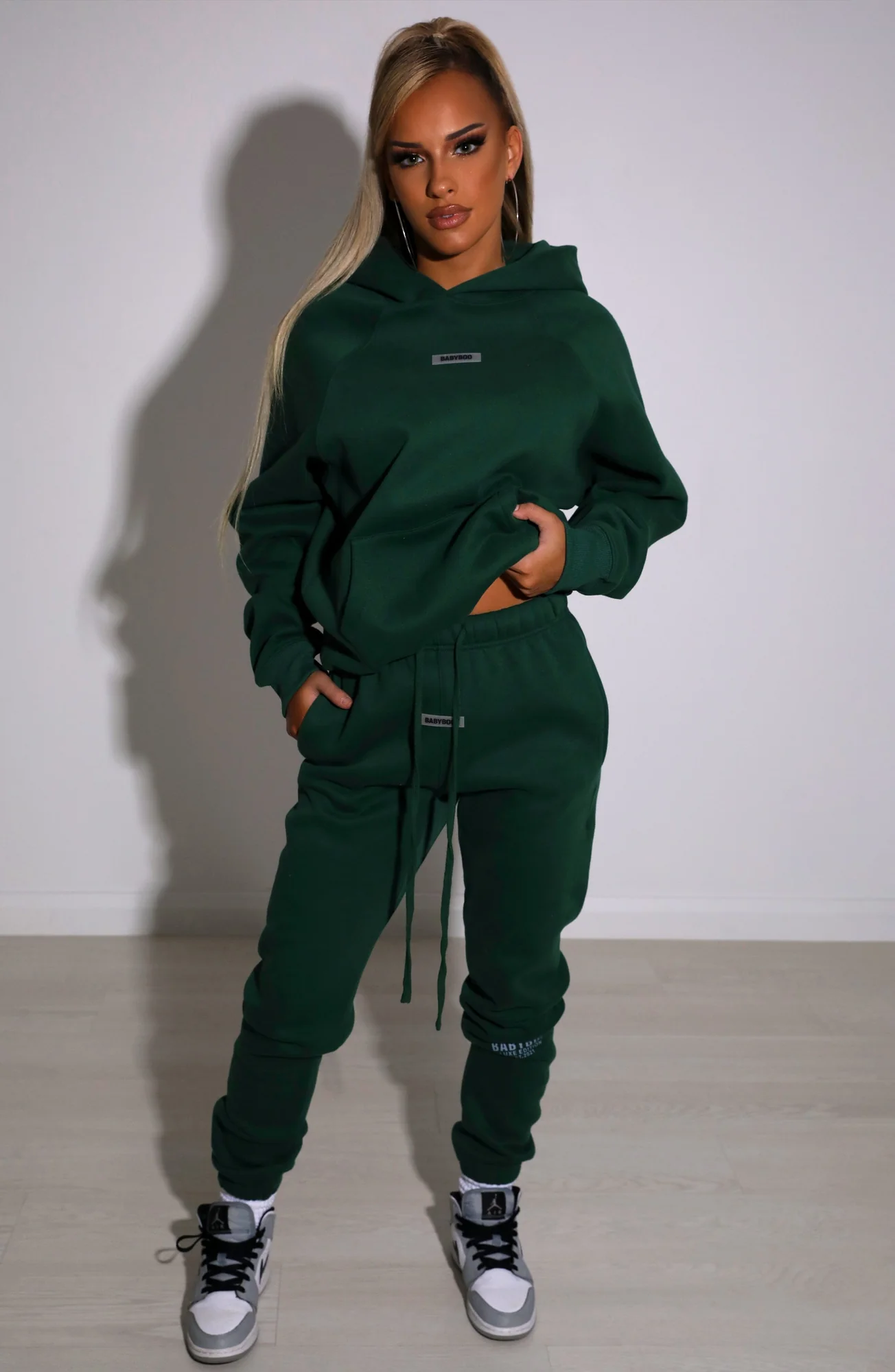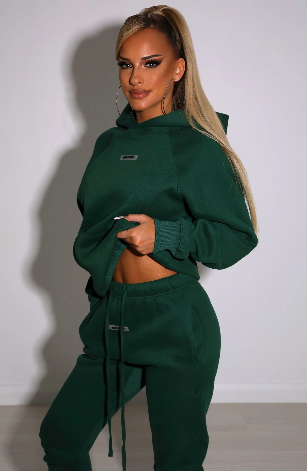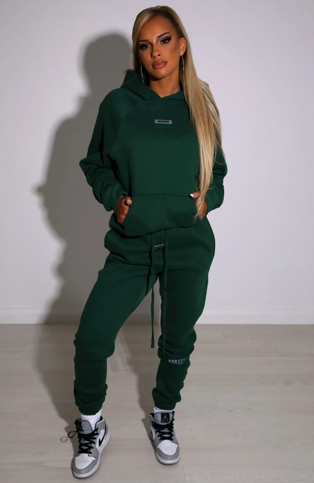 The Emerald Cotton Fleece Hoodie features a functional front pocket, ribbed cuffs, and hem. Stay cozy in style with the Babyboo logo on the chest, hood, and sleeve. This hoodie is made of Cotton Fleece material, ensuring a comfortable and fashionable look. The over-sized fit complements your unique style effortlessly. Model is wearing a size XS. This hoodie is a must-have for a chic and comfortable look in all seasons.