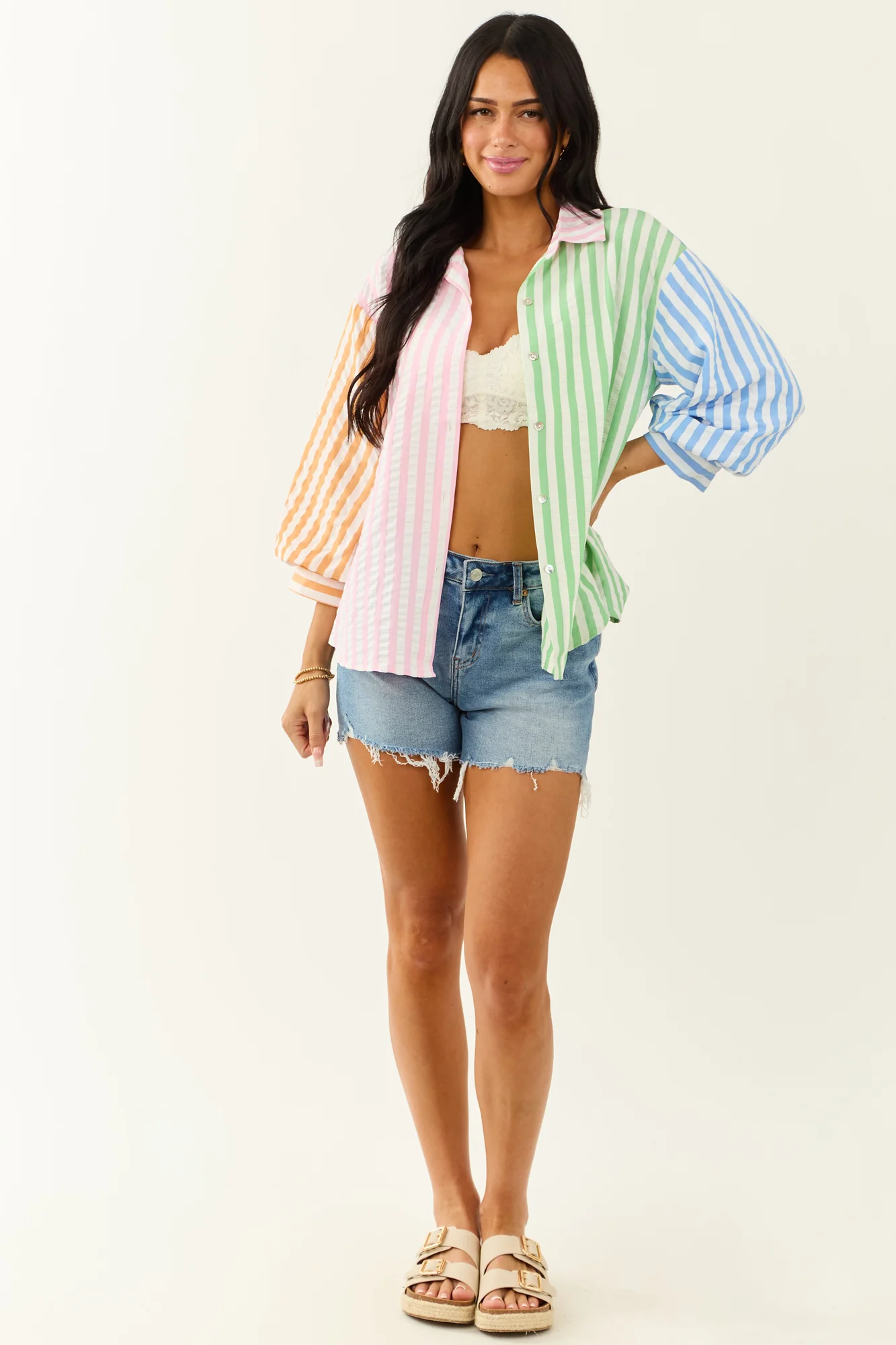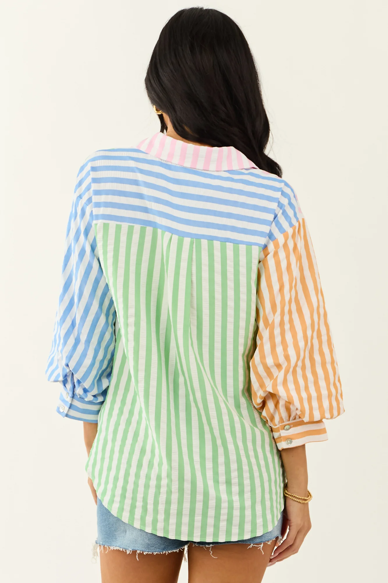 Elevate your style with this oversized fit top featuring colorblock stripes in Baby Pink, Pistachio, Tangerine, and Cornflower. The button-down design with collared banded cuffs and 3/4 bubble sleeves adds a polished twist to your look. Crafted from a blend of 50% Polyester, 49% Rayon, and 1% Spandex with 100% Polyester lining for comfort. Perfect for Spring and Summer fashion. Available in sizes S, M, L.