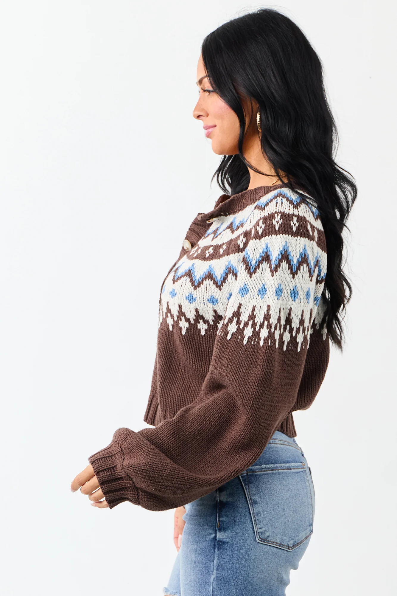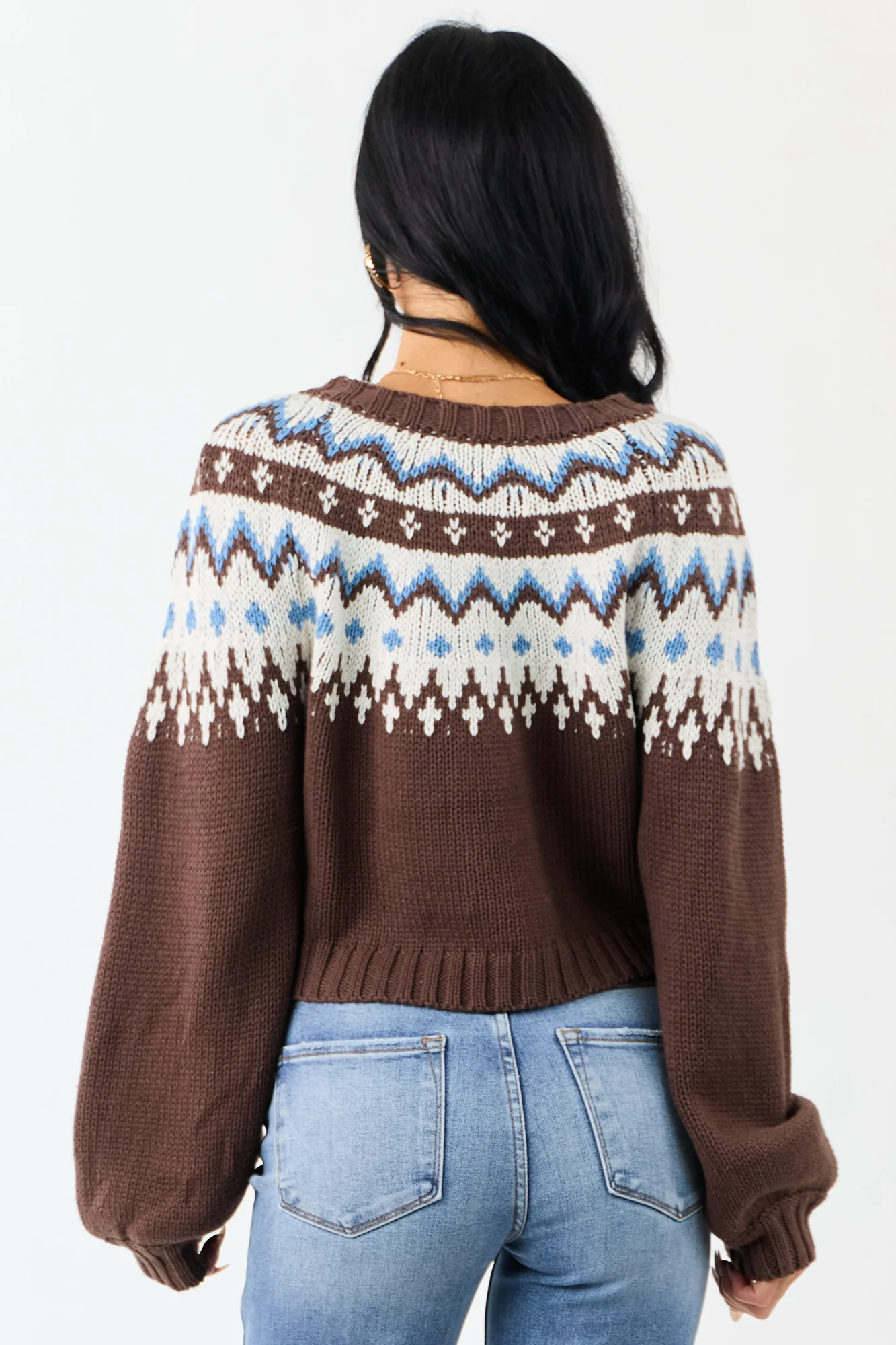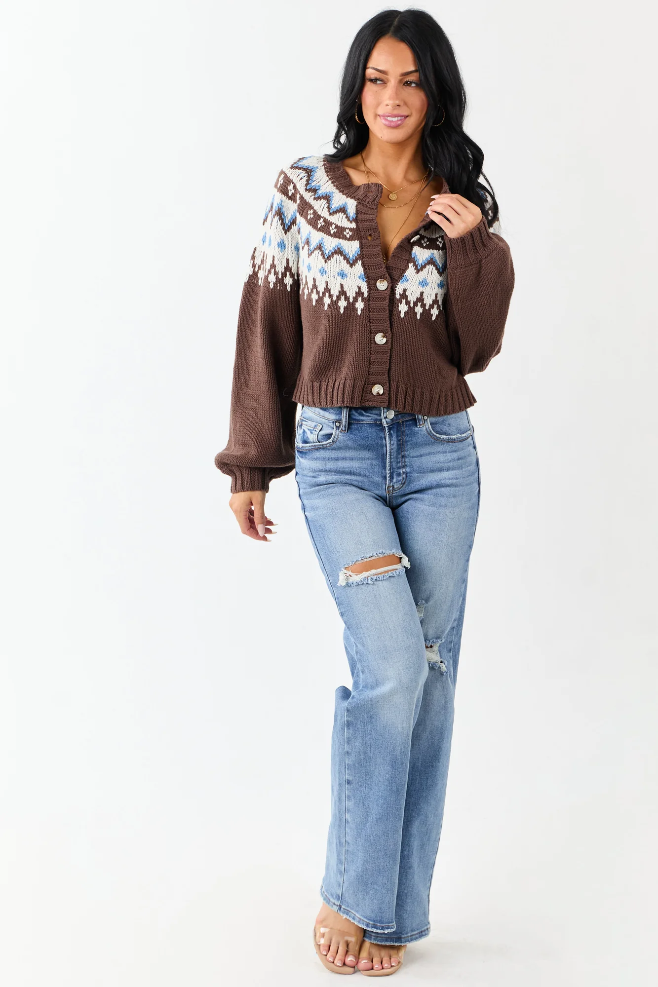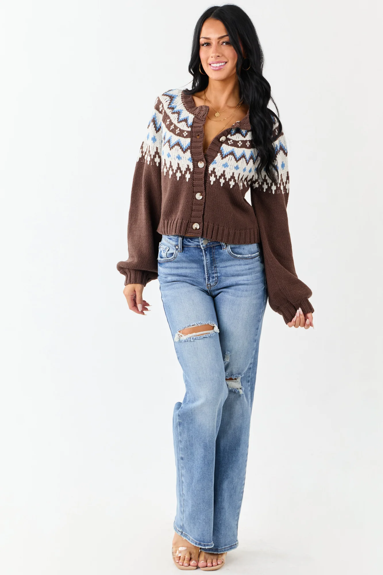 Indulge in pure cozy-chic energy with this stretchy ribbed Fair Isle cardigan that suits all occasions from coffee refills to chilly evenings. Embrace the semi-cropped style with intricate print details in shades of Ivory and Cornflower, featuring long bubble sleeves for a snug fit. Crafted from a blend of 60% Cotton and 40% Acrylic, this imported cardigan spells comfort and style. Model is wearing a size Small with a height of 59″, Bust 34″, and Waist 26″.