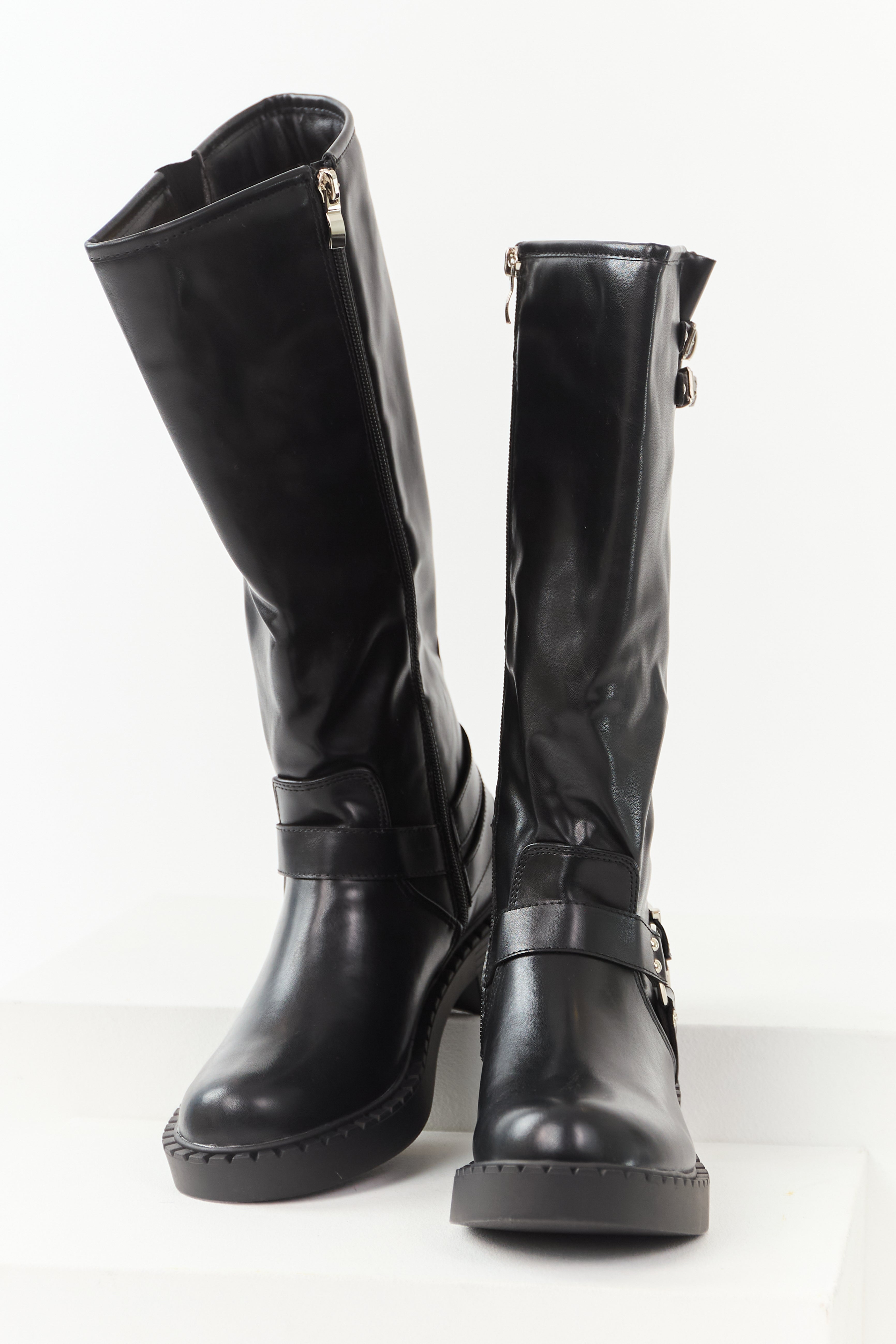 Elevate your style during chilly seasons with these chic black faux leather tall boots adorned with stylish buckle details. Crafted from non-stretchy faux leather, these boots feature a side zipper, rounded toe, 15″ shaft, 17″ circumference, and comfortable 2″ heel with a 1″ platform. Imported. Available in various sizes. Perfect for adding edge to your fall and winter outfits. Stay warm and fashionable with Berness.