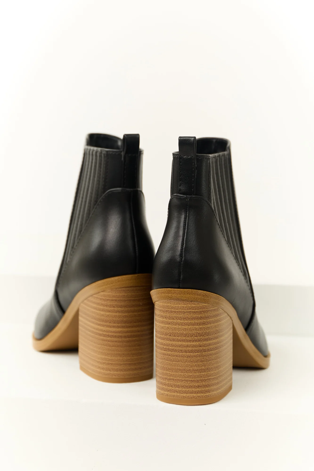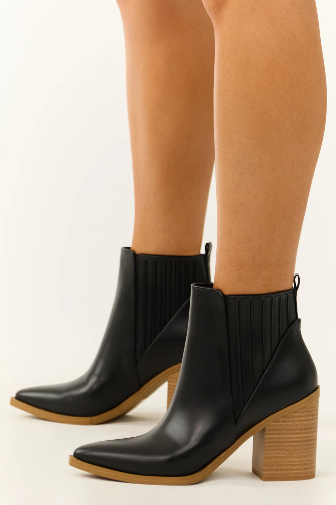 Step up your style game with these black faux leather heeled booties featuring stretchy side panels for easy wear. The pointed toe and block heel add a touch of elegance to any outfit. These boots have a comfortable 3.5-inch heel height, a 6-inch shaft, and a 9-inch circumference. Imported product expertly crafted for a fashionable look available in various sizes from 5.5 to 10.
