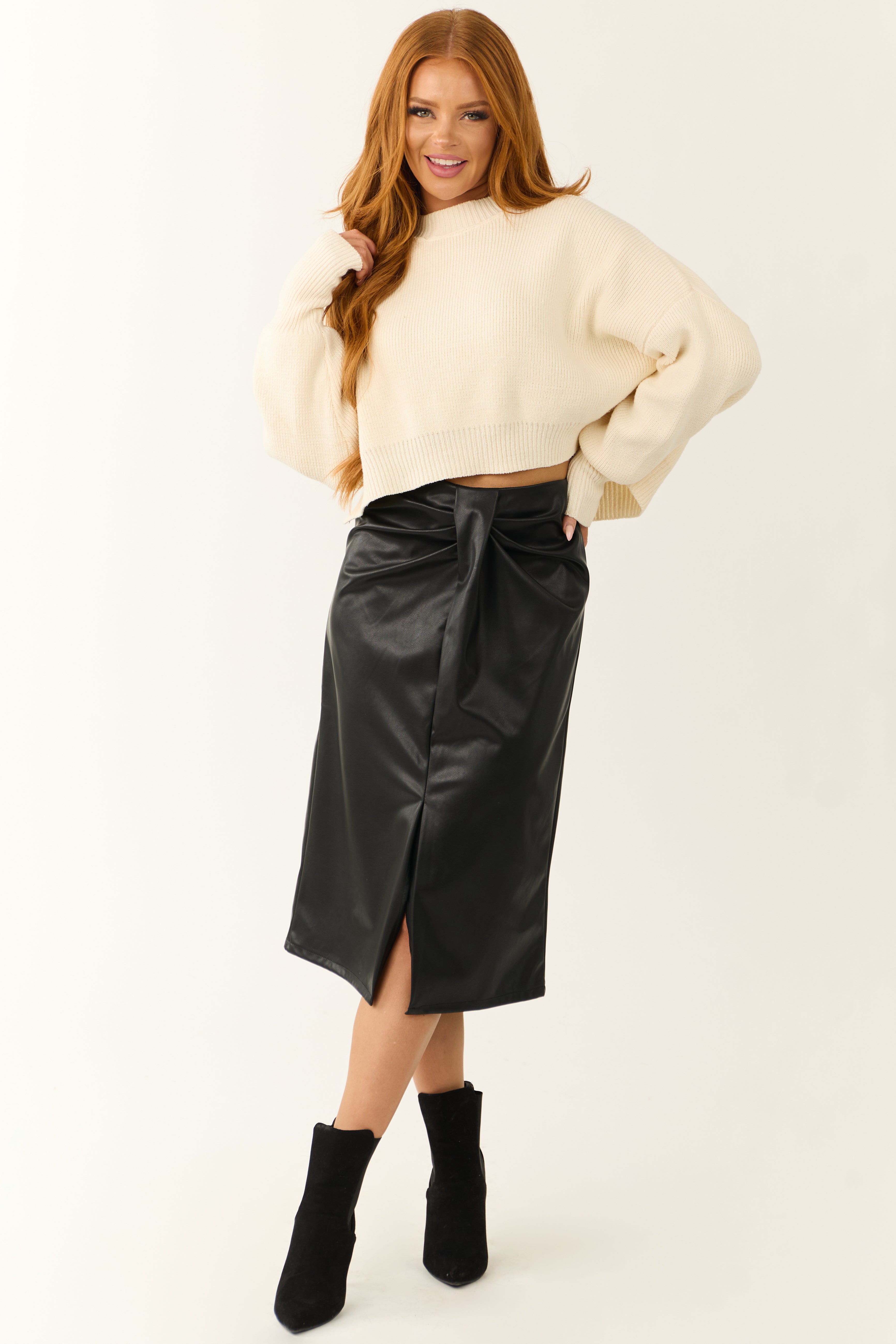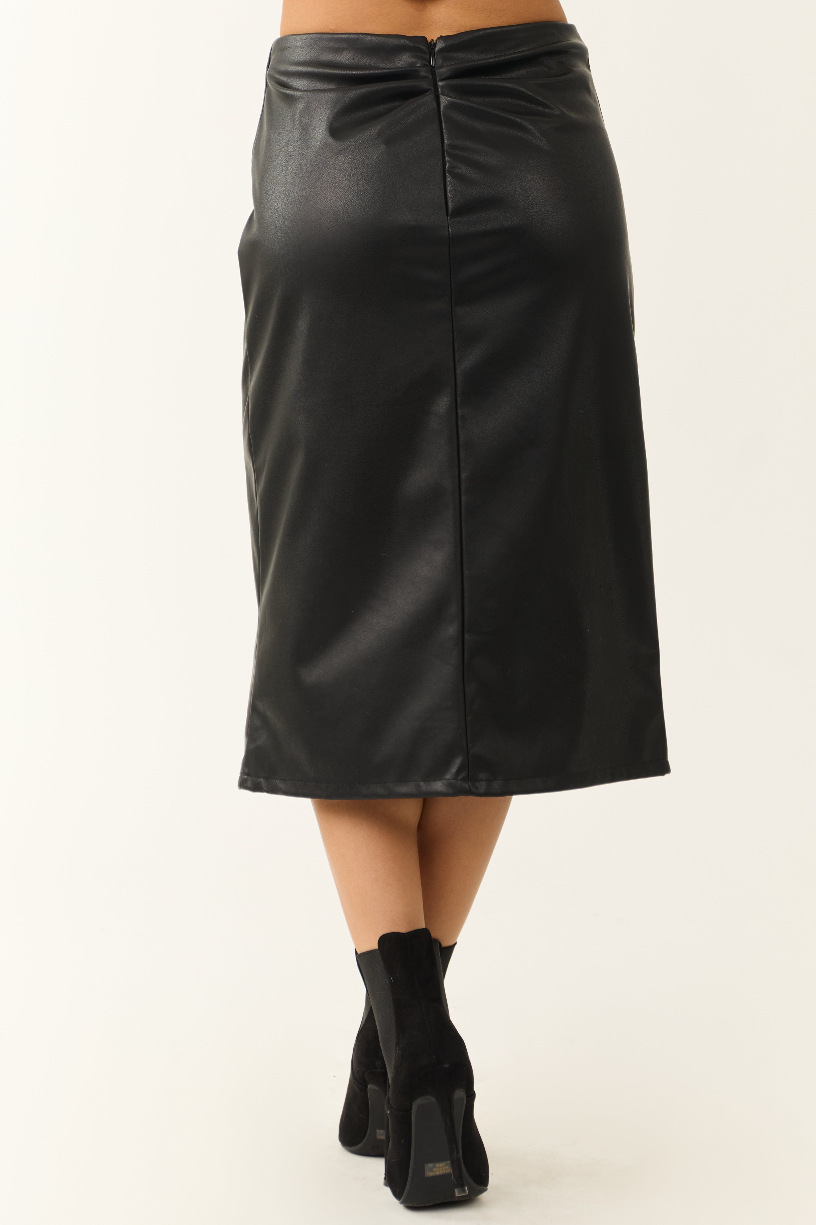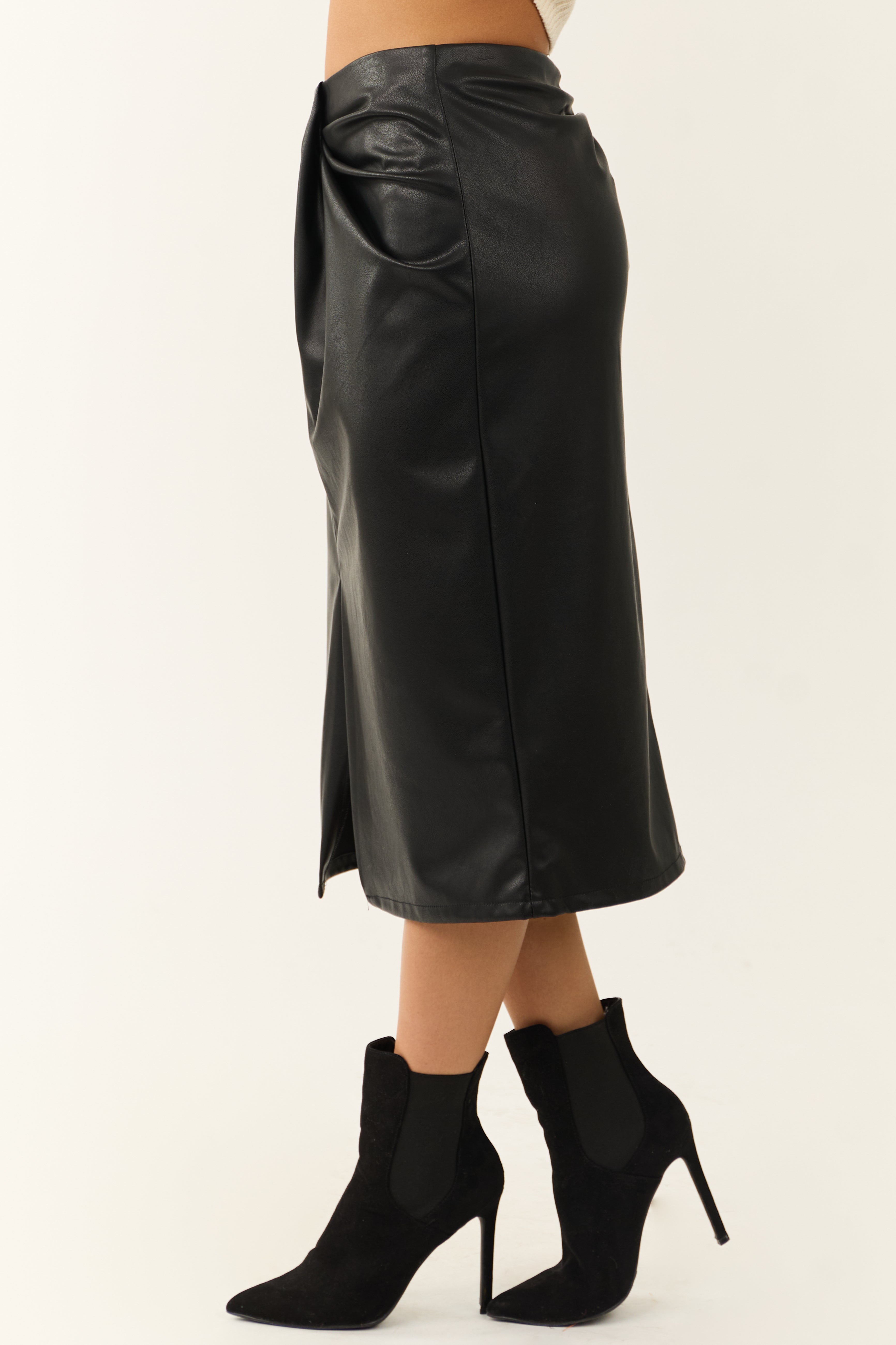 Indulge in the chic elegance of our Black Faux Leather Pleated Midi Skirt . Crafted from a non-stretchy blend of 55% Polyester and 45% Polyurethane, this sophisticated skirt features pleating details, a back zipper, and a ruched back design. Unlined for a lightweight feel, this imported skirt comes with care instructions for hand wash cold, hang dry, and low-heat ironing. Perfect for date nights in the fall or winter seasons. Model Size: Small. Height: 55″. Bust: 31″. Waist: 24″.