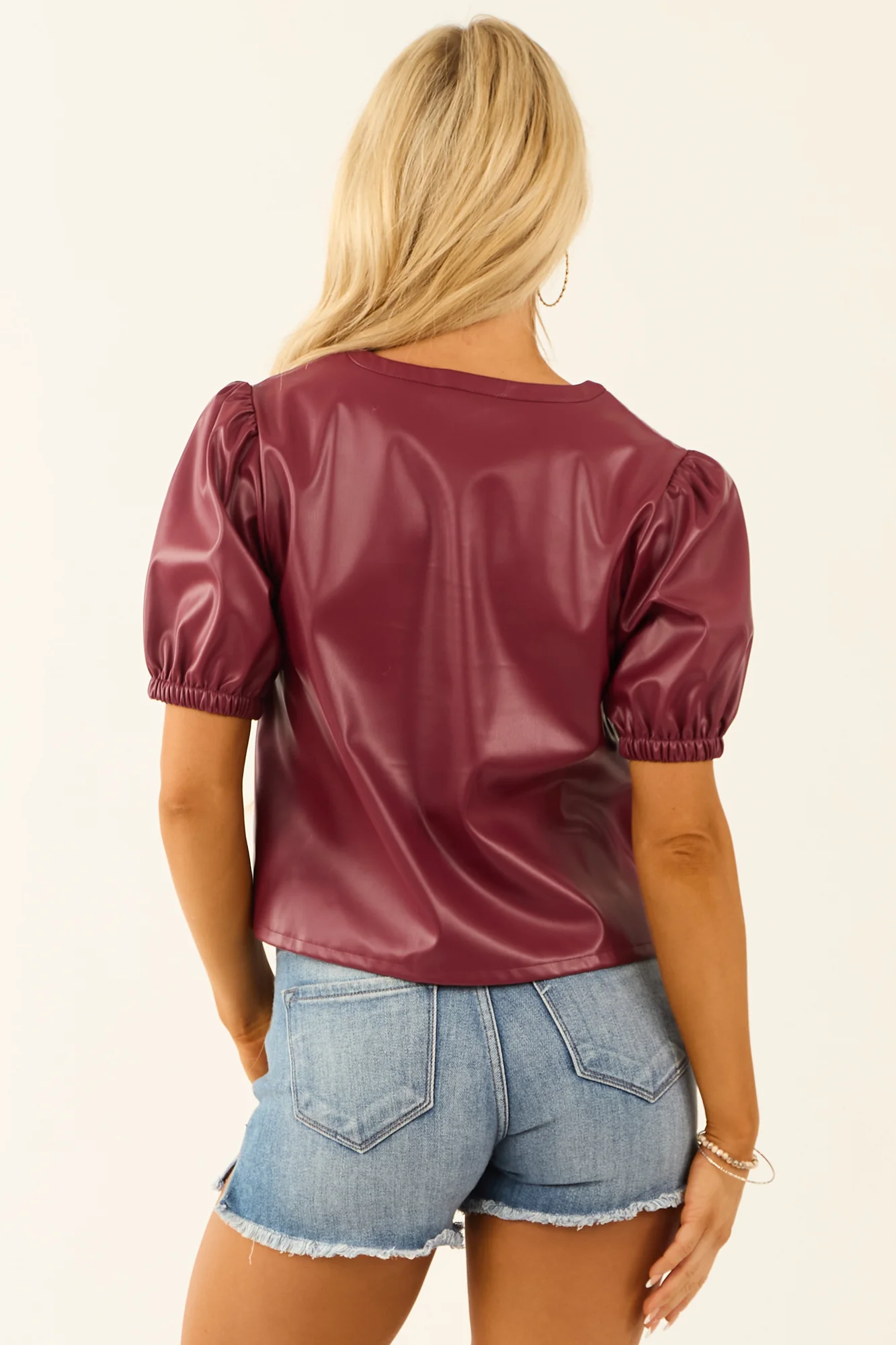 Indulge in sophistication with our Wine Faux Leather Puff Sleeve Top. Crafted from non-stretchy faux leather, this top features a chic V neckline, stylish short puff sleeves, and elegant front seam details. Perfect for both casual outings and nights out, this top is a versatile addition to your wardrobe. Hand wash recommended. Model is wearing a size Small. Model’s Profile: Size 1, Height 57″, Bust 34″, Waist 26″.