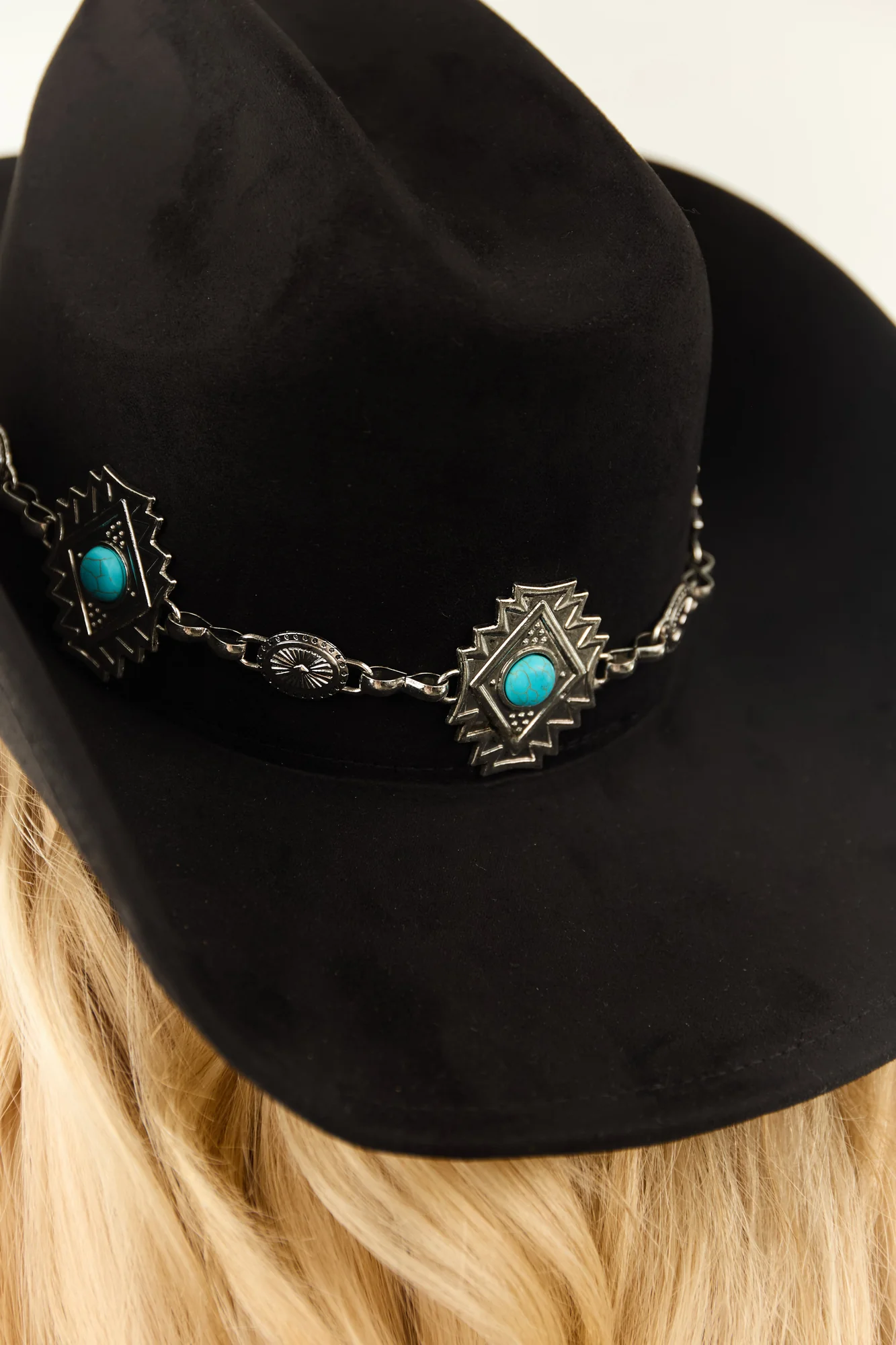 Make a bold Southwestern statement with this faux suede cowboy hat featuring a silver concho band. The eye-catching design includes a turquoise accent, curved brim, dented crown, and is made of 90% polyester and 10% alloy. Imported. One-size-fits-most for exceptional comfort and style that stands out. Ideal for adding a touch of Western flair to any outfit. Height: 5″. Brim: 3.5″. Circumference: 26″.