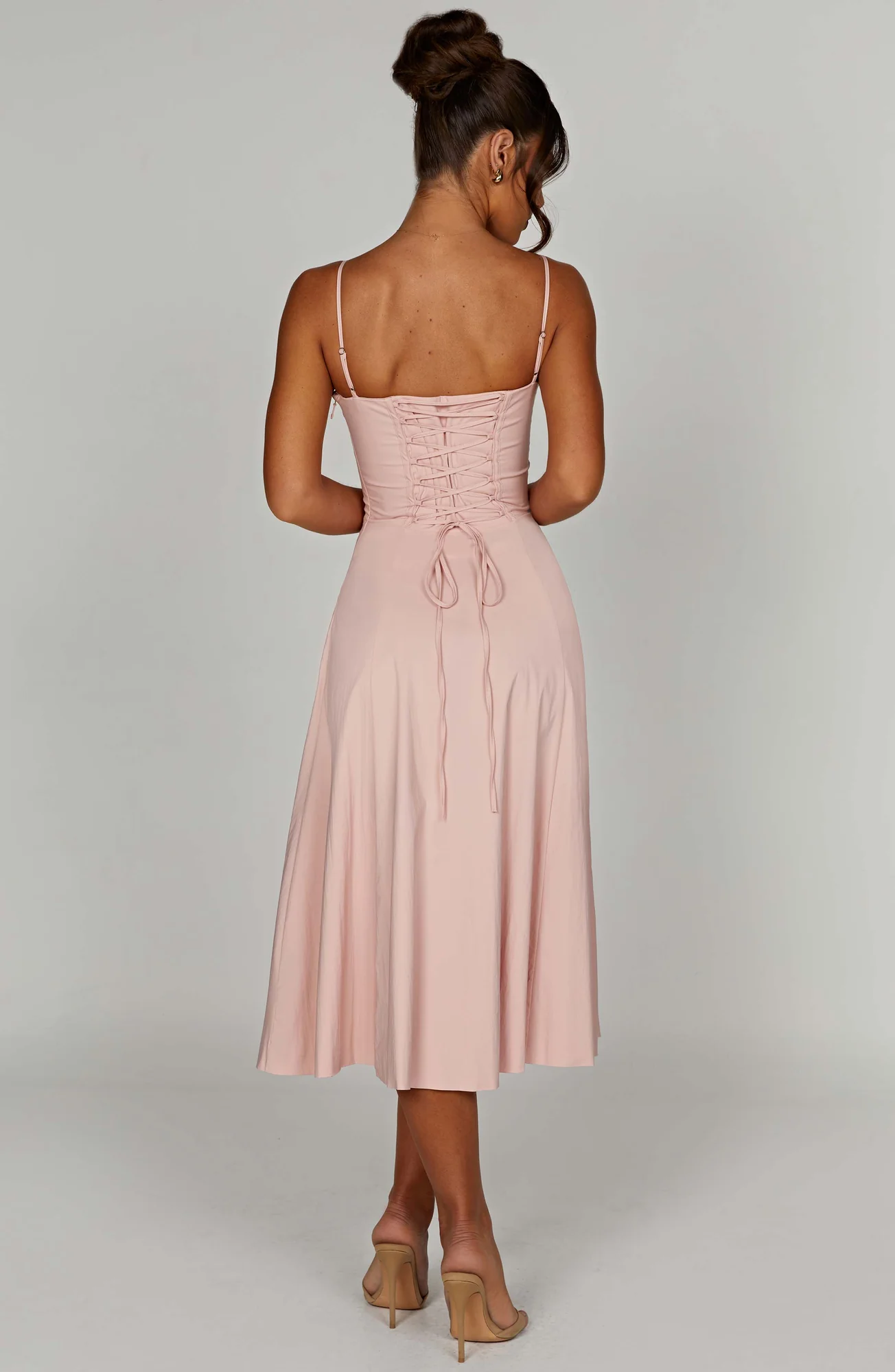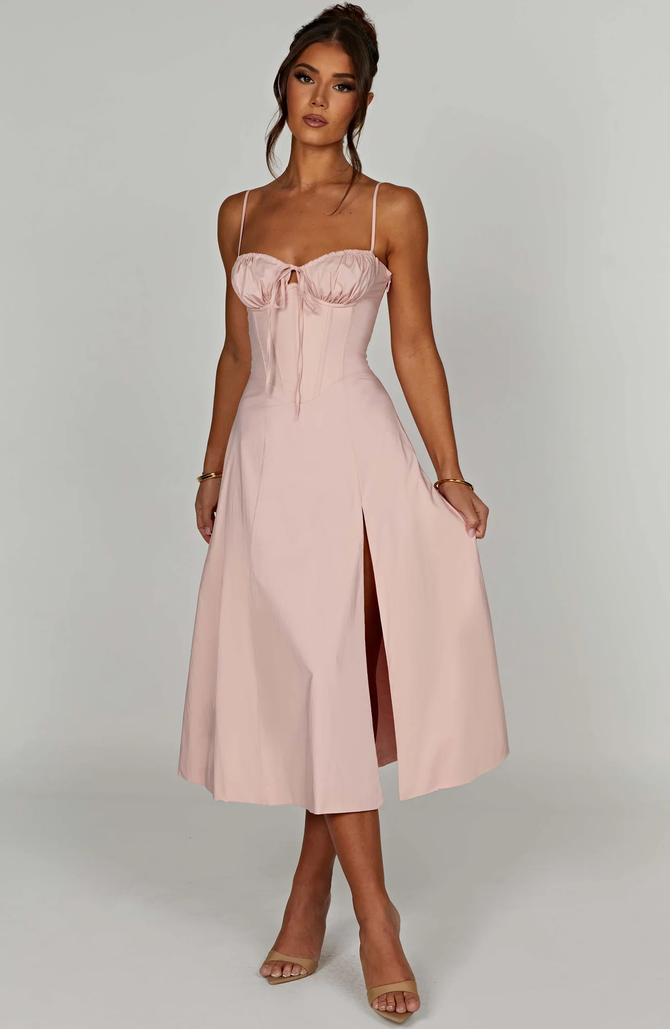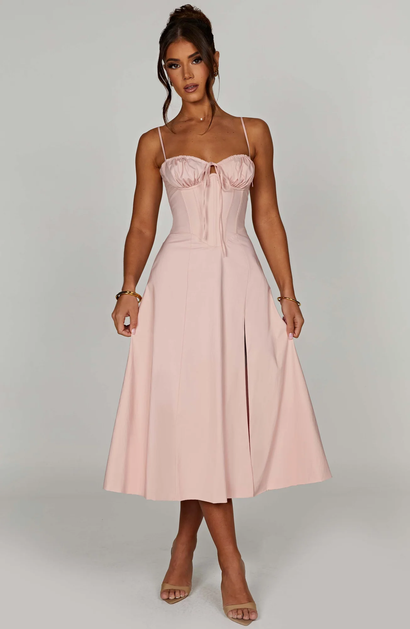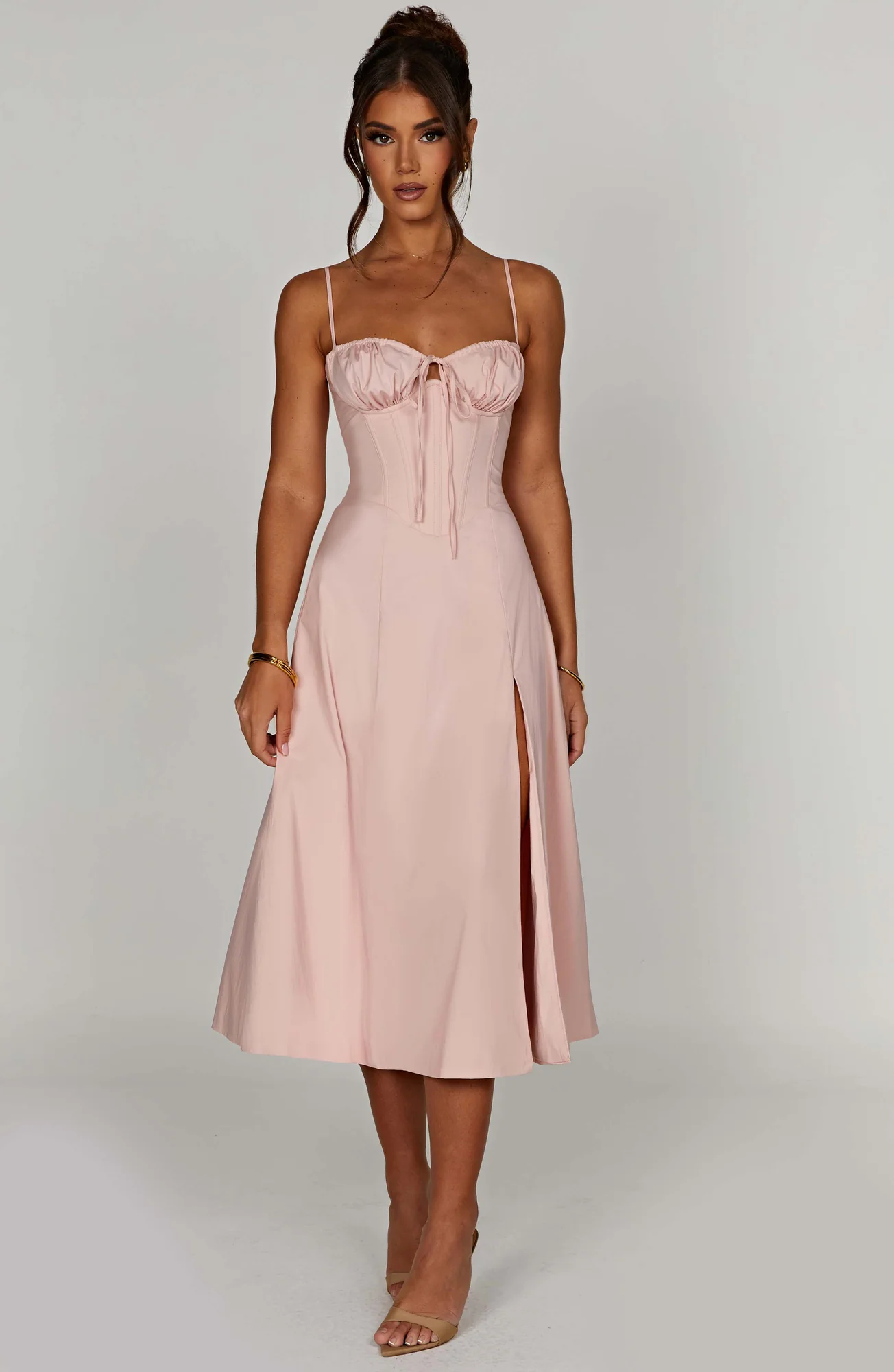 Indulge in the dreamy Deanna midi dress in stunning blush. Crafted from a luxurious woven cotton blend, this ultra-feminine dress features a figure-enhancing corseted bodice, a delicately gathered bust with a drawstring tie detail, and a thigh-high split for a touch of allure. Embrace elegance and style with this midi dress perfect for various occasions. This premium garment ensures you look as good as you feel. Available sizes: S, M, L, XL, XXL.