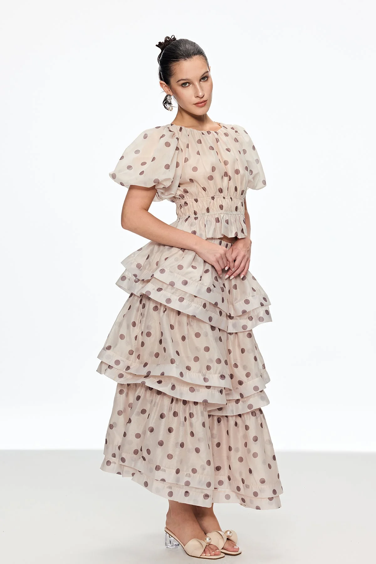 Elevate your style with this feminine and sophisticated Dot Ruffle Skirt Set. Featuring a unique balloon sleeve design and playful ruffle details, this set offers comfort and style for any occasion. Crafted with high-quality materials – 50% Polyester, 50% Cotton blend. It comes in a non-stretch fabric, easy to clean with a gentle machine wash. The color may vary slightly due to lighting in images, adding charm to its appeal.