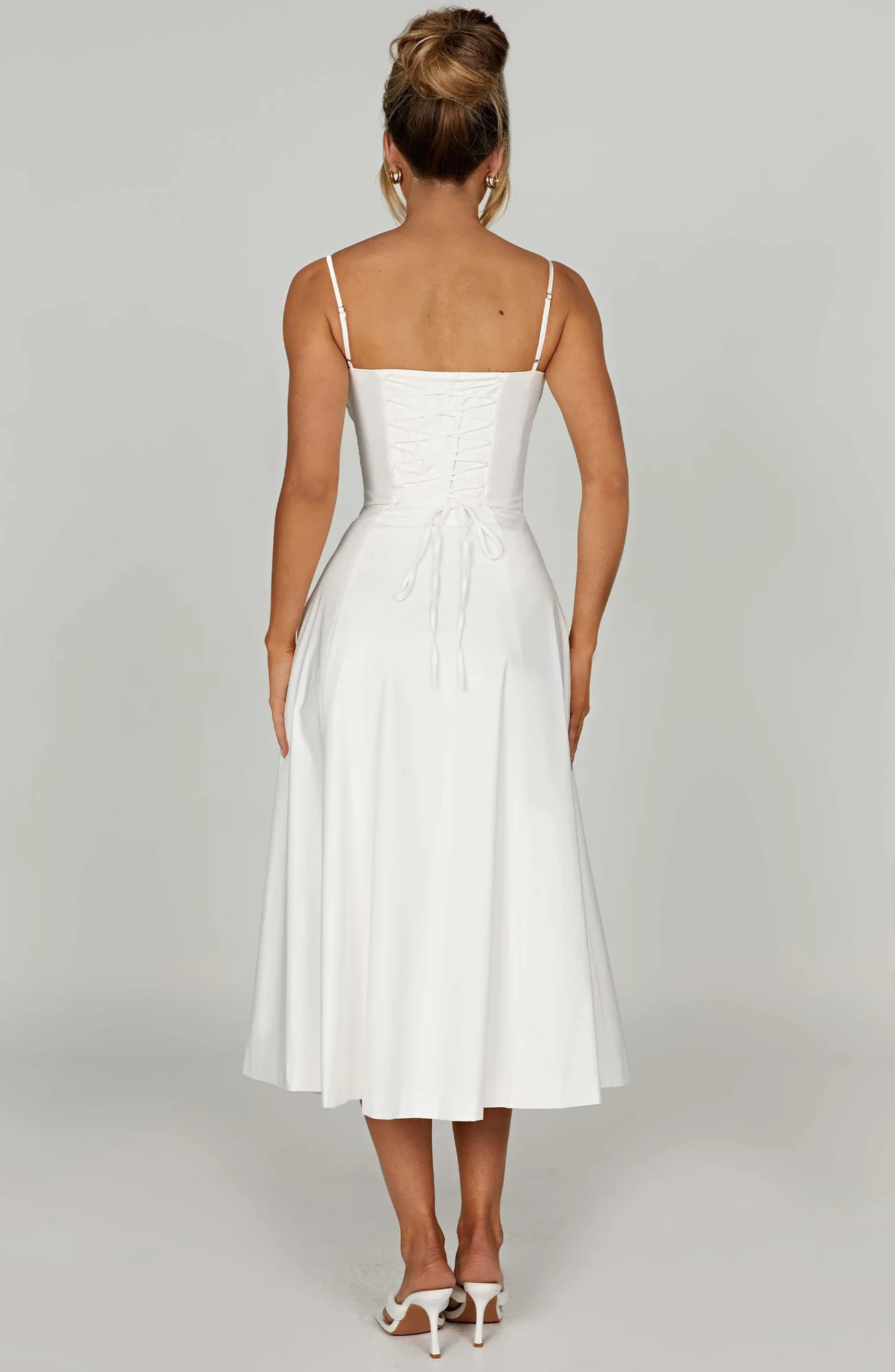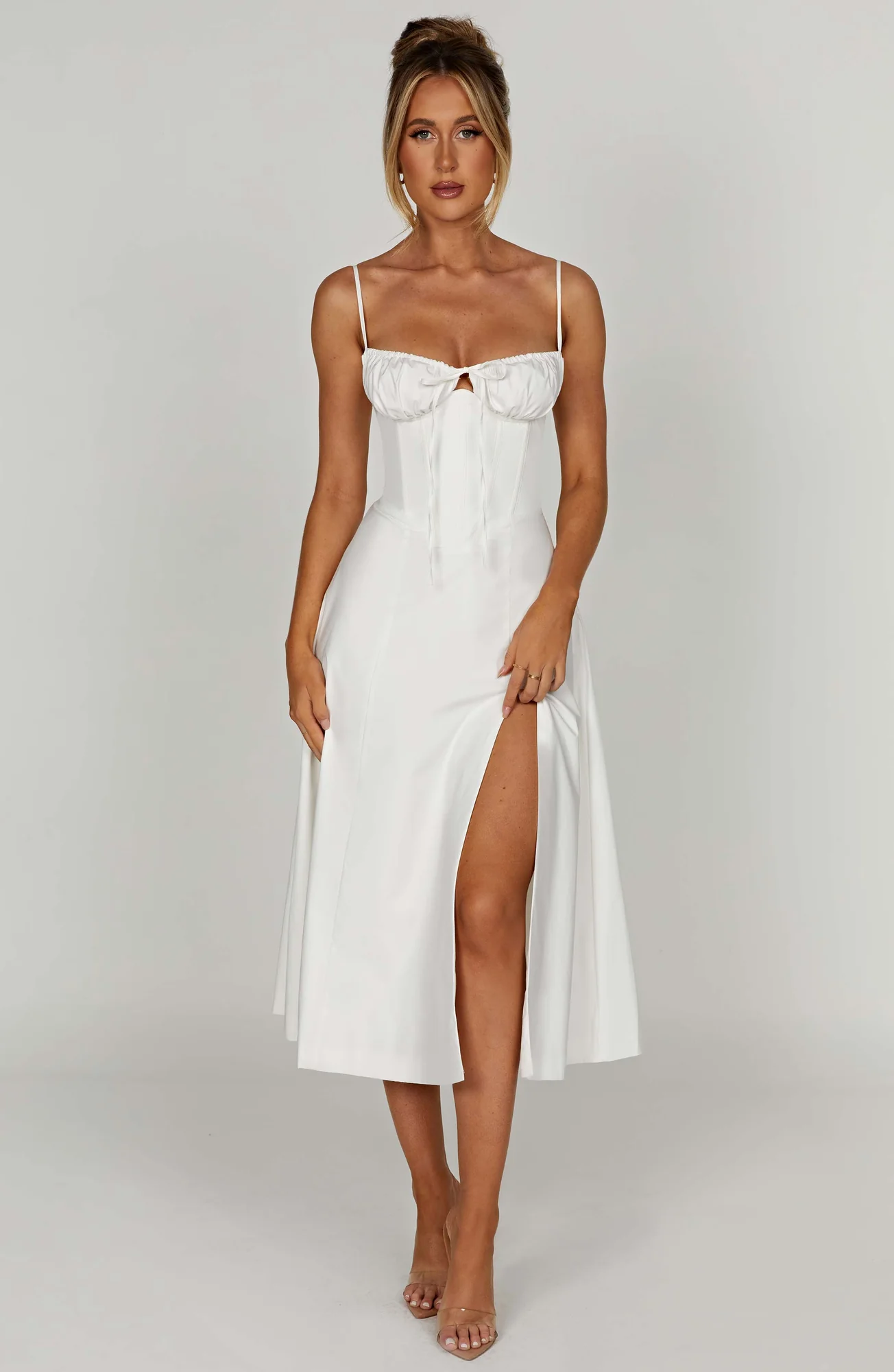 Indulge in the dreamy allure of this ultra-feminine corseted midi dress crafted from a premium woven cotton blend fabric. Featuring a waist-cinching bodice, a gathered bust with a drawstring tie, and a flirtatious thigh-high split on the midi skirt. Elevate your look effortlessly with a knot and heeled mules. Ideal for various occasions from bridal showers to holiday parties. Feel as good as you look in this exquisite ivory piece. Available in multiple sizes.