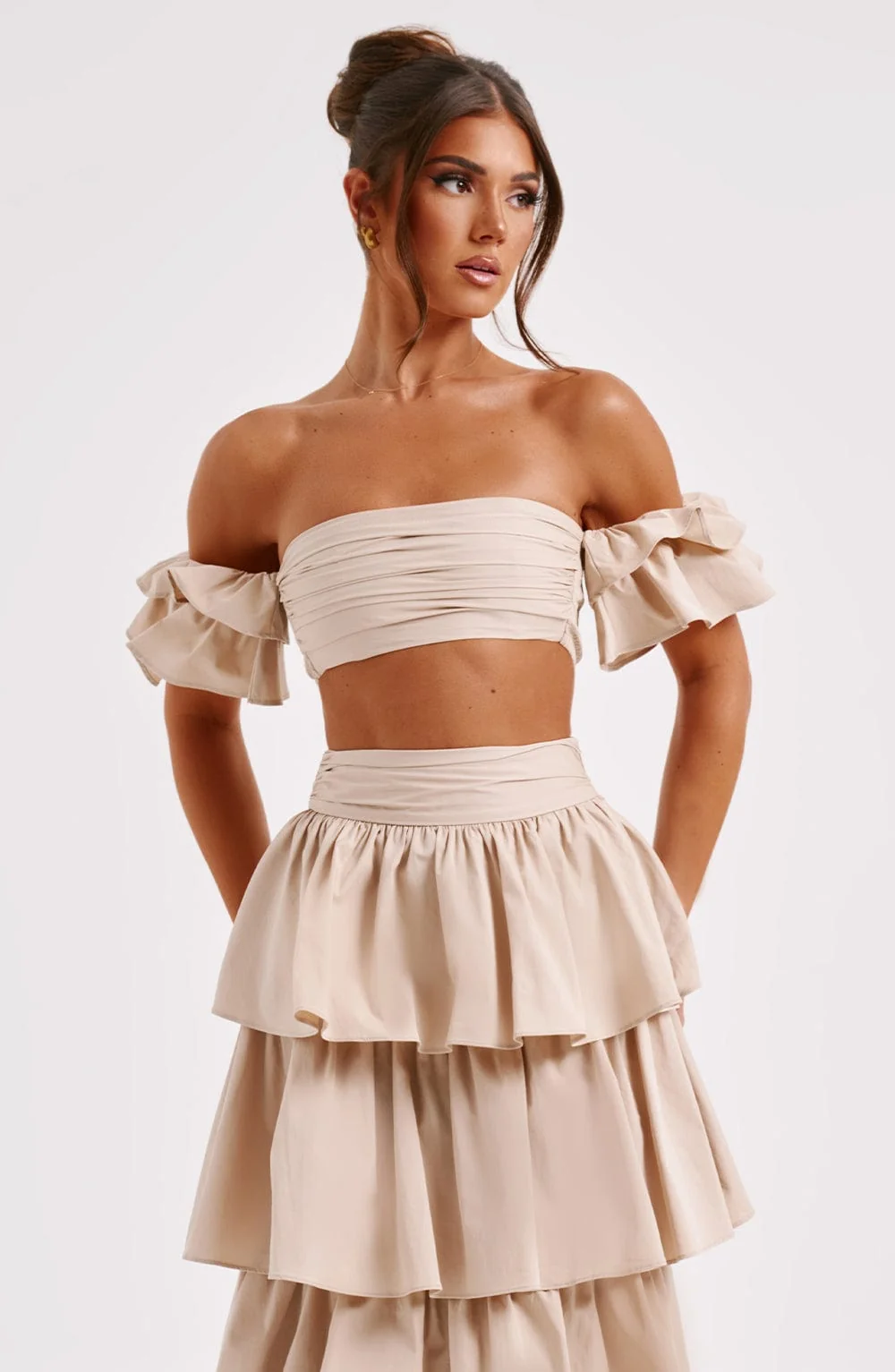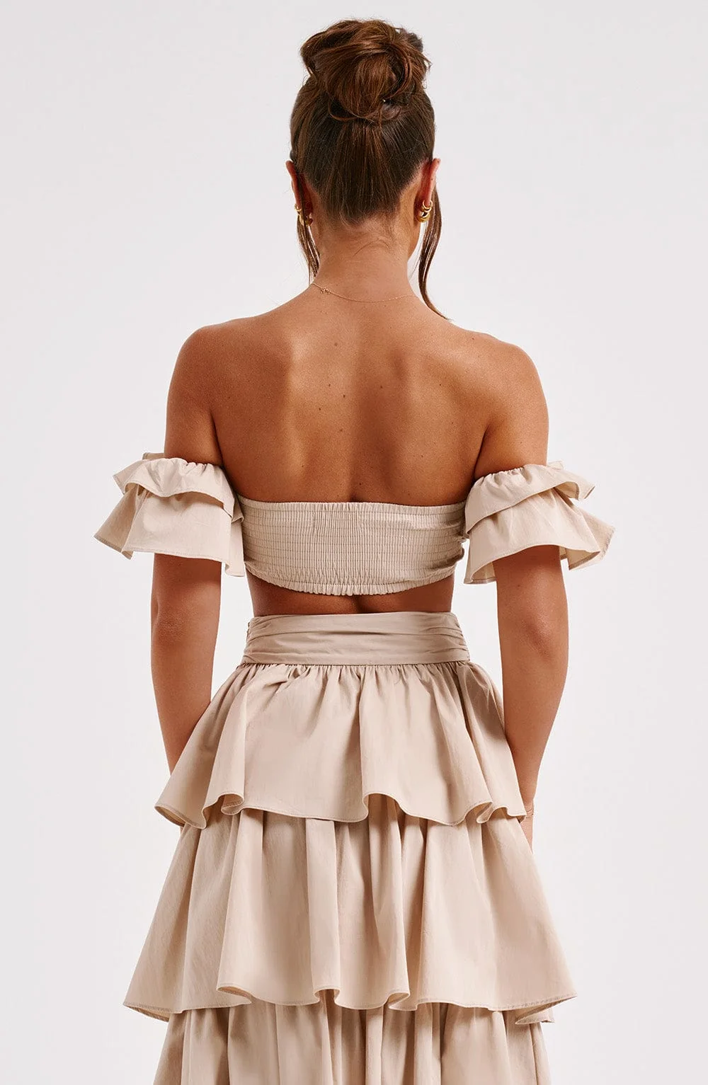 Indulge in the vision of elegance with our Feminine Off-Shoulder Beige Crop Top from the Joy set. Crafted from premium cotton, this pretty top features ruffle sleeves, a cropped length, and off-the-shoulder styling. Elevate your wardrobe with this versatile piece suitable for various occasions. Model is wearing size XS.