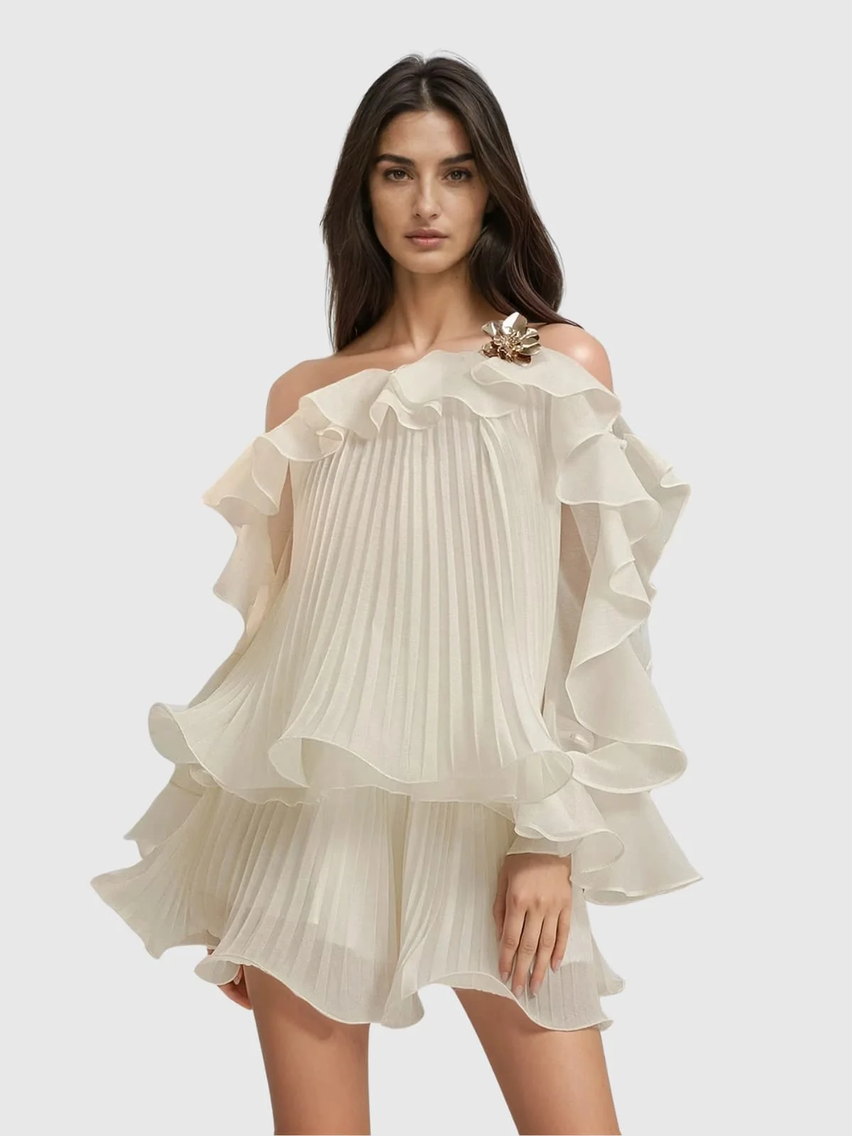 Elevate your style effortlessly with the Feminine Ruffle Pleated Skirt Set. This set combines delicate ruffles and flowing pleats for a look that exudes modern elegance and feminine charm. Whether for casual outings or special occasions, it offers a flattering silhouette that moves gracefully with you, ensuring comfort without compromising on style. Made of 100% Polyester with a slight stretch, this set is not only eye-catching but also comfortable to wear. Feel confident and stylish in every movement with this versatile ensemble. Color variations may occur due to lighting differences in images. Dry clean recommended for maintenance. Model is shown wearing size S.