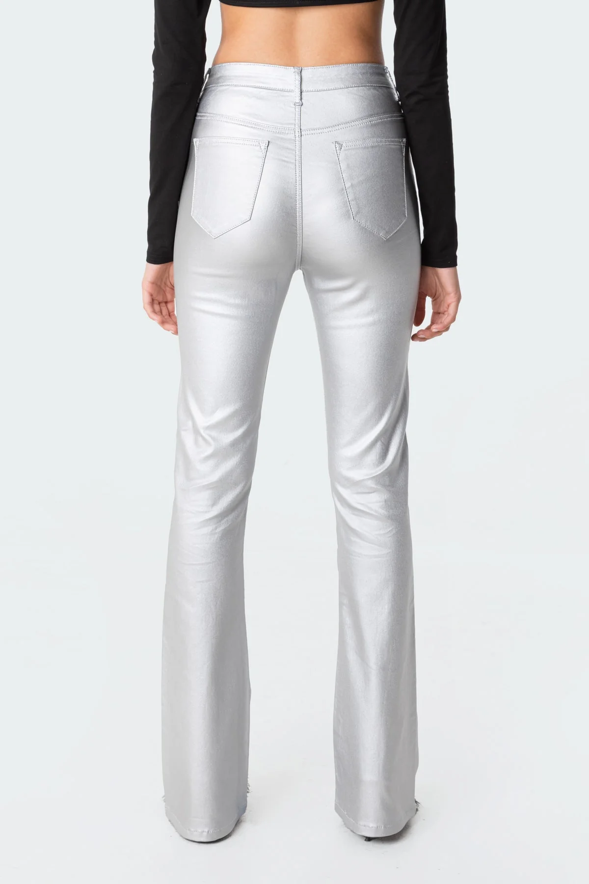 Indulge in the luxurious flair with our Silver Faux Leather Flare Pants, crafted from a blend of Polyester, Rayon, and Spandex for a perfect fit and stylish look. These pants feature a flared design that elongates your silhouette, making them the ideal choice for fashion-forward individuals. Our model showcases the size small, emphasizing the versatile appeal that complements a height of 57. To care for this exquisite piece, simply hand wash for lasting quality and elegance.