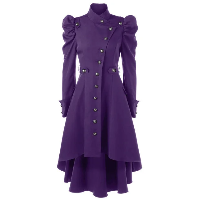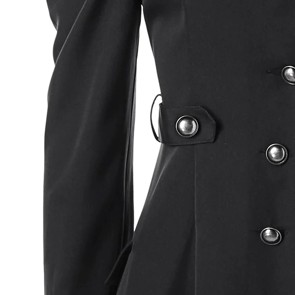 Indulge in the allure of this vampire-style trench coat featuring a stylish flared hem, stand-up collar, and elegant big turned-up cuffs. Embrace its lightweight design crafted from a breezy unlined polyester/cotton blend perfect for those who dare to stand out. Available in multiple mesmerizing colors and various sizes to suit your preference. Make a bold fashion statement wearing this distinctive coat.