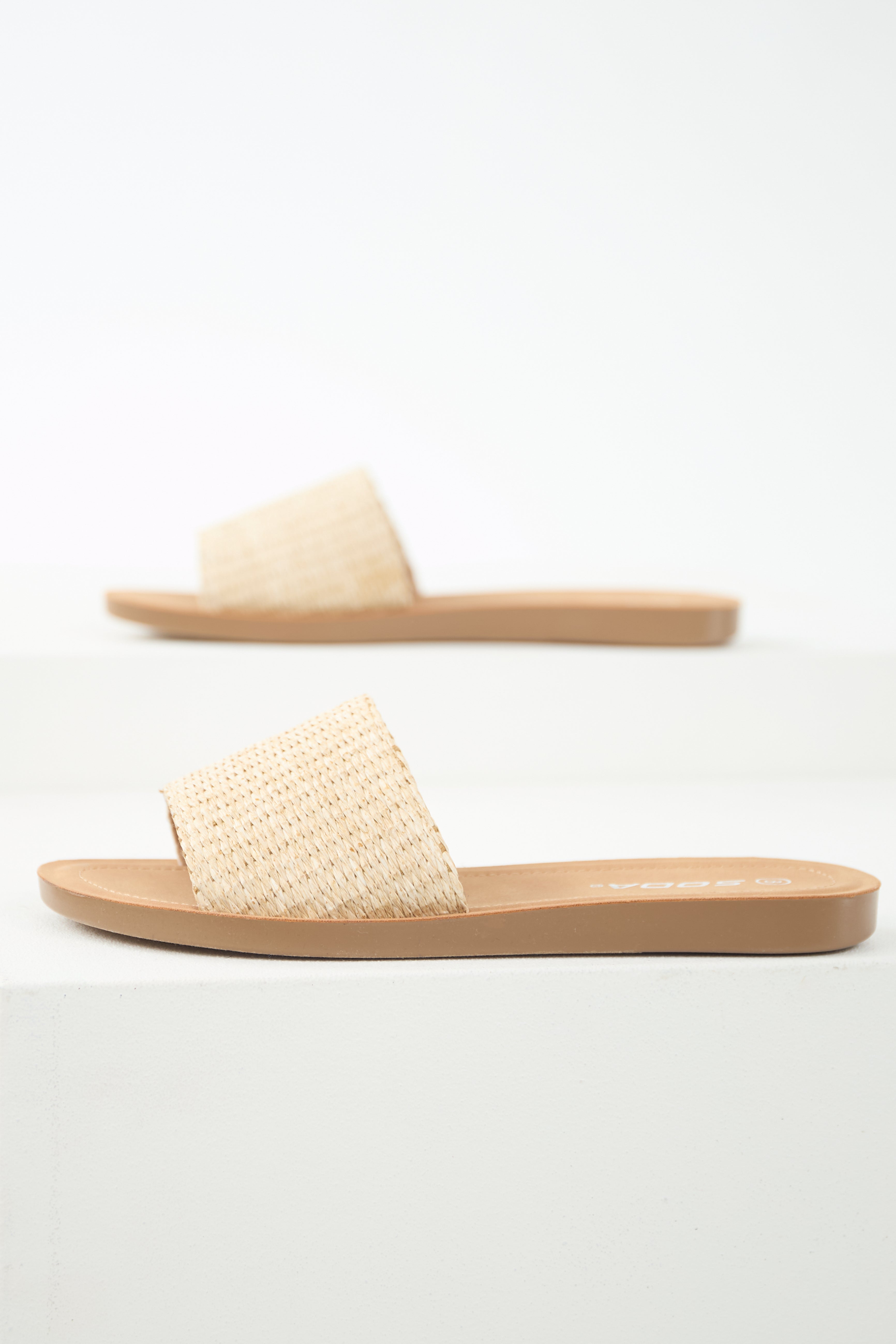 Experience comfort and style with these White Open Toe Flat Sandals. Crafted with a woven straw band for a chic look. Slip-on design with a slightly cushioned insole for all-day wear. Featuring a low heel of 0.25 inches and a 10-inch circumference. Perfect for casual outings and warm weather. Imported. Available in sizes 5.5 to 10.