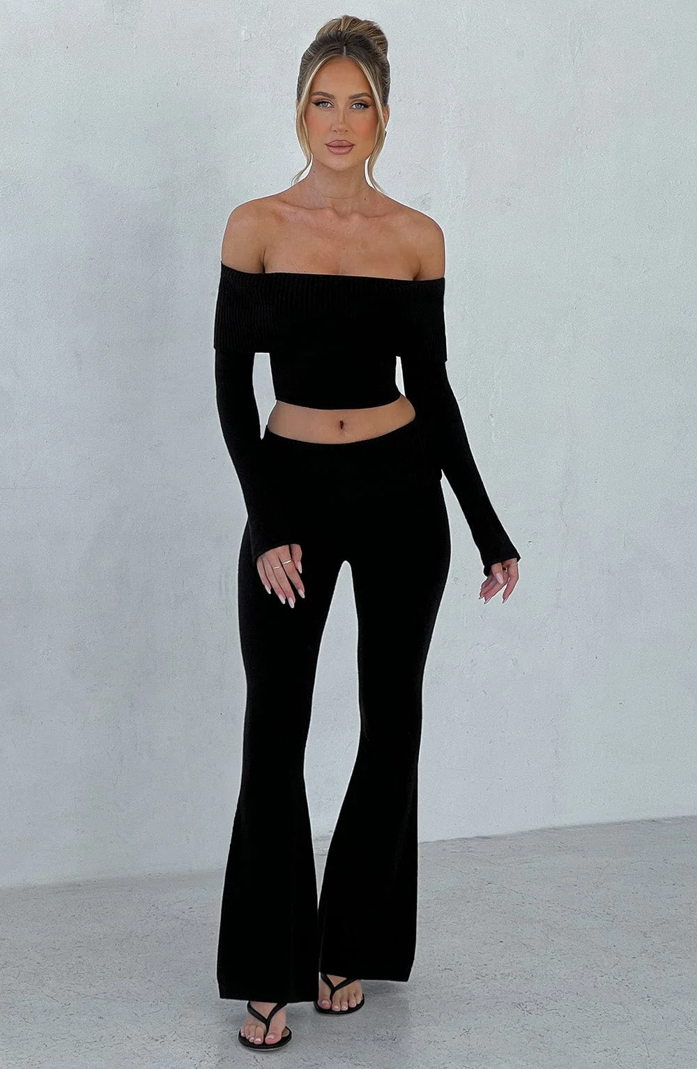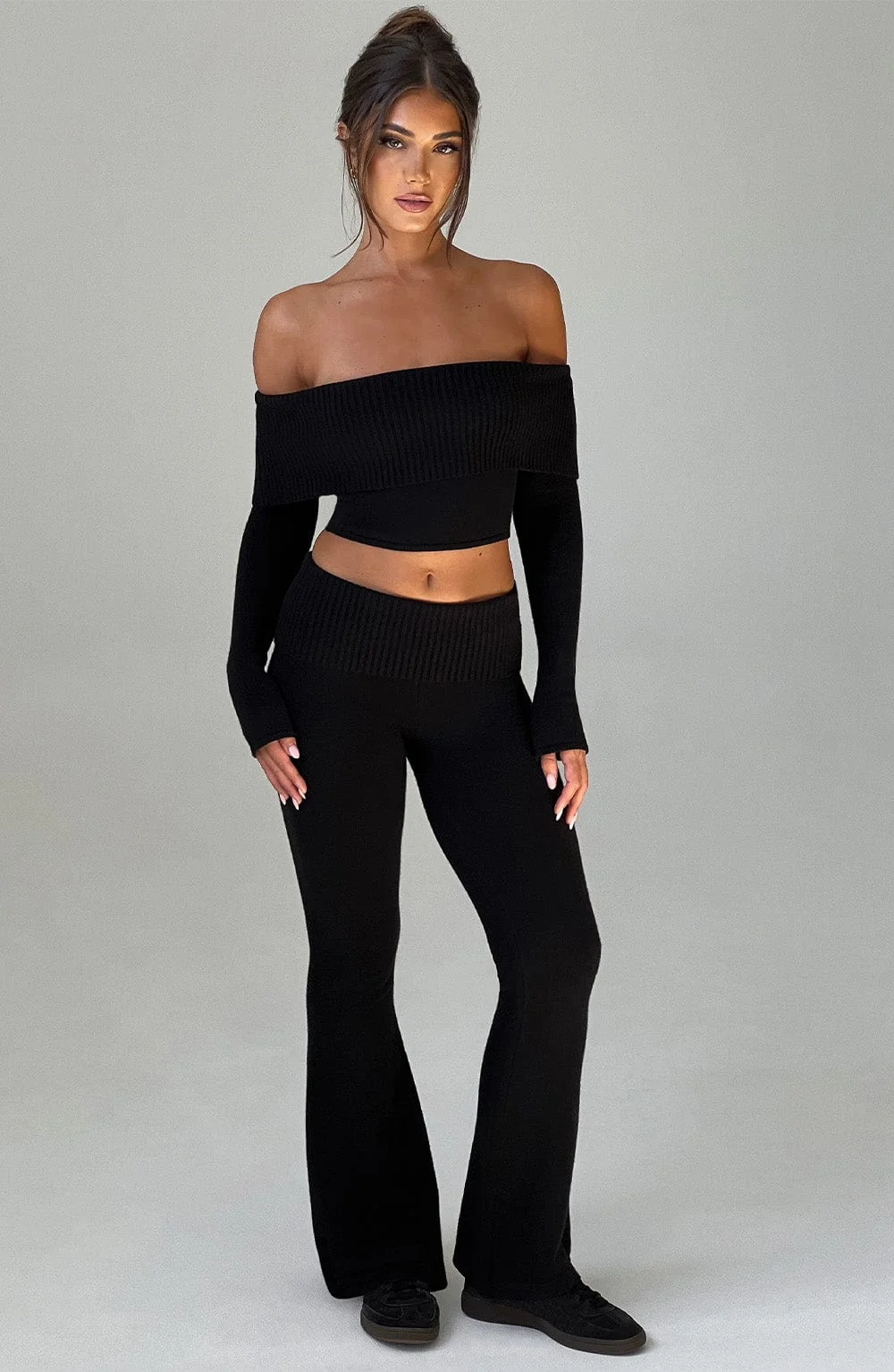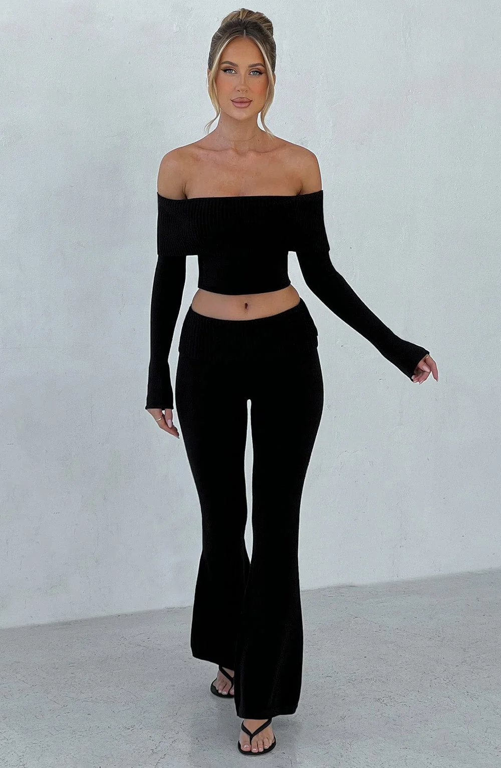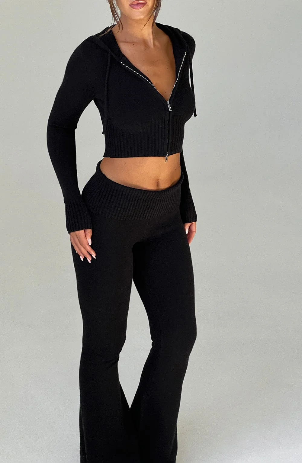 Upgrade your wardrobe with the must-have Flare Knit Pants in sleek black. These versatile pants feature a wide rib waistband for added style, a flattering fit and flare silhouette, and a fold-over waistband detail. Match them with the coordinating knit hoodie for a complete look that exudes elegance. These regular-length pants are perfect for any occasion, from casual daytime outings to cozy winter days. The unlined design with a wide 2×2 rib waistband and internal elastic ensures comfort and style. Available in sizes XS to XXL. Model is wearing size XS.