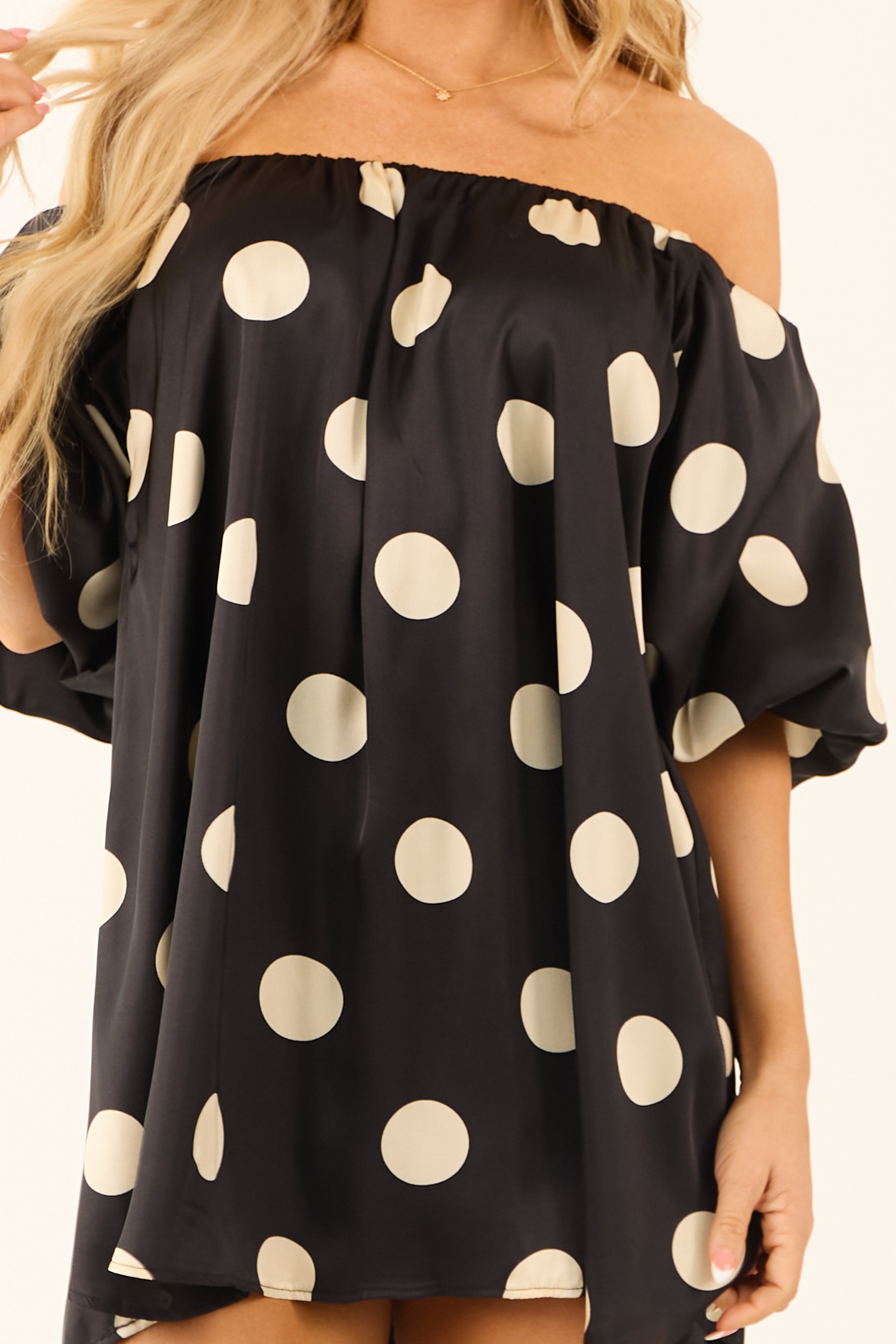 Indulge in the timeless elegance of our Black and Cream Polka Dot Off Shoulder Mini Dress. Crafted from non-stretchy woven fabric, this dress features a half puff sleeve with elastic cuffs and neckline. Available in sizes S, M, and L with slightly larger dimensions. Perfect for any occasion, whether its a casual outing or a special event. Hand wash cold to maintain the prints vibrancy. Stand out in style with this feminine and chic dress that exudes sophistication.