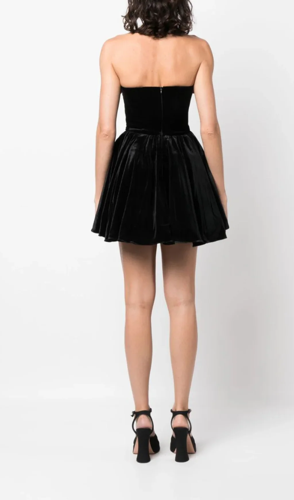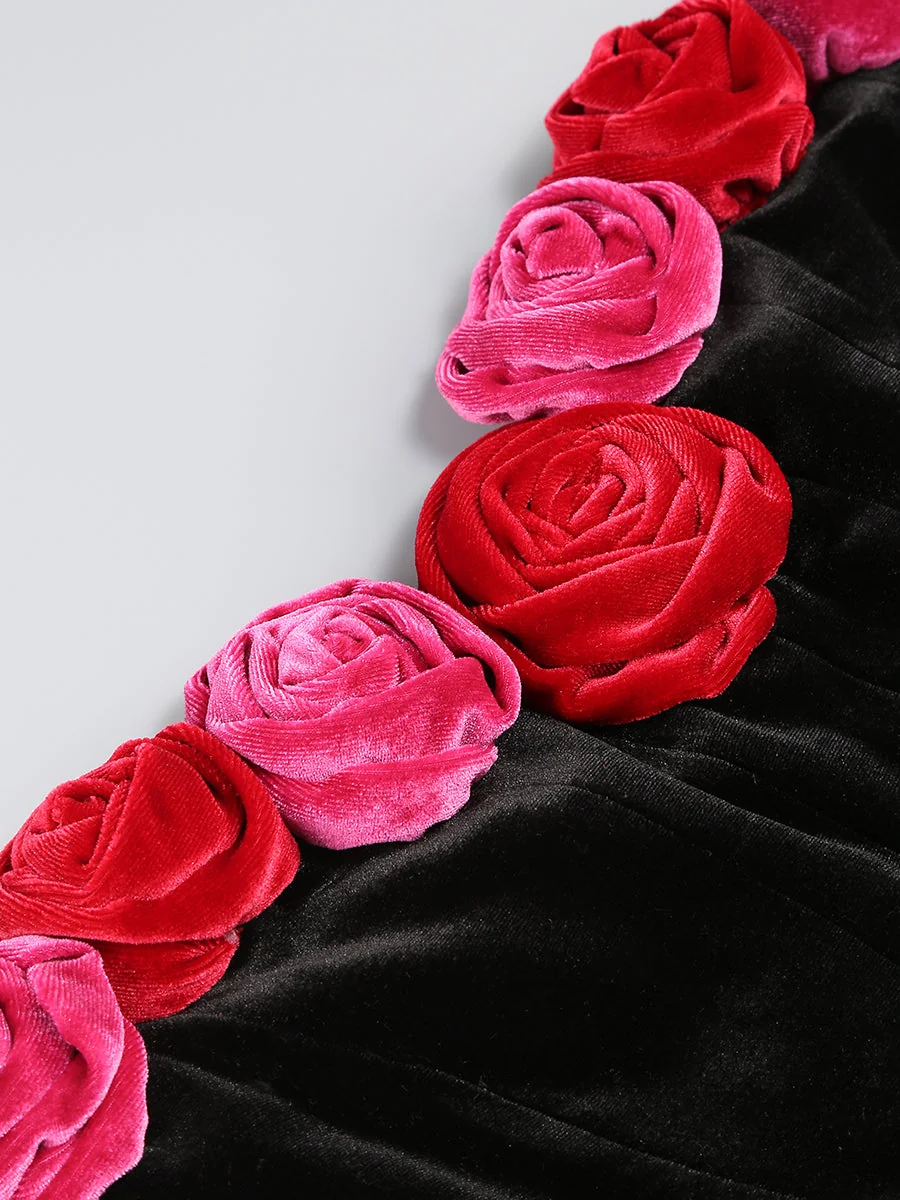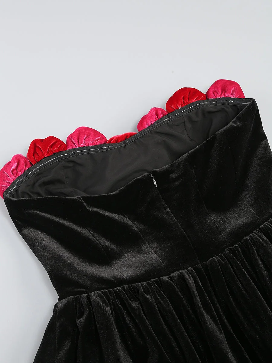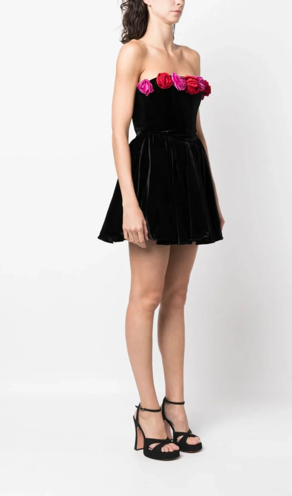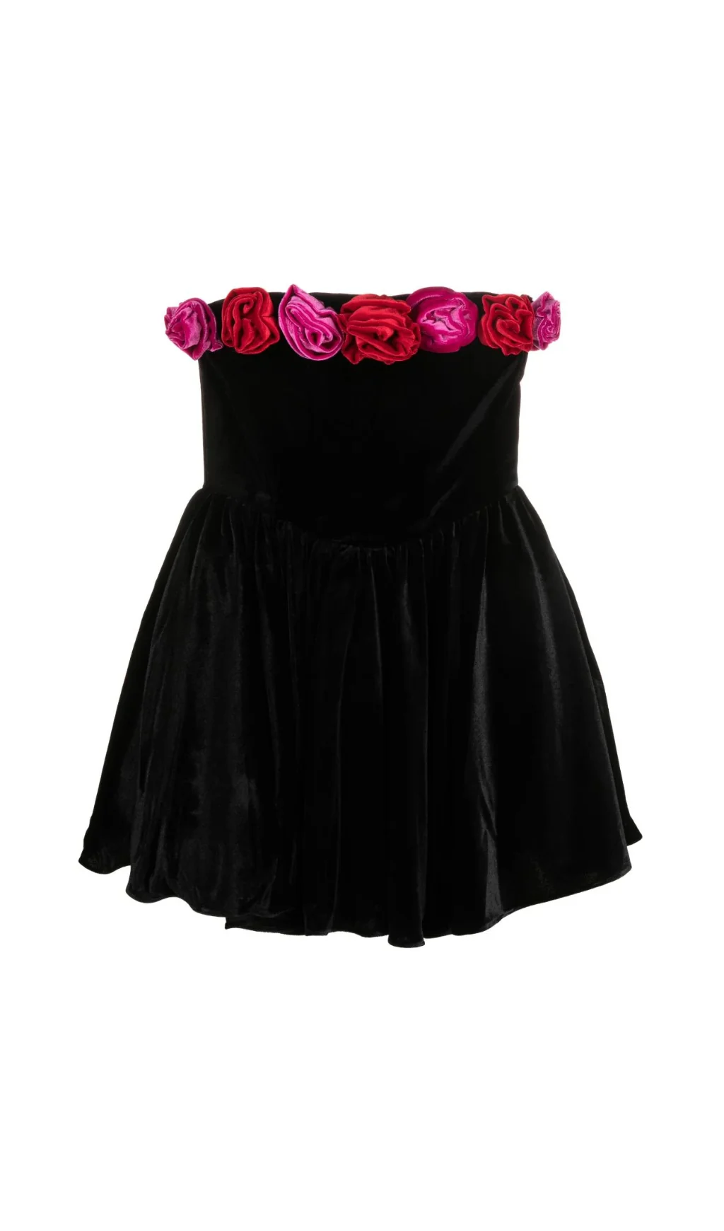 Elevate your style with our Floral Applique Off-Shoulder Mini Dress. The delicate floral appliques add a romantic touch, while the trendy off-shoulder design exudes flair. Perfect for various occasions, from brunch to date night. This must-have piece features a velvet effect, rear zip fastening, strapless design, and a straight hem. Made of 100% Polyester. Dry clean only. Please refer to our size chart for the best fit. Dress runs true to size.