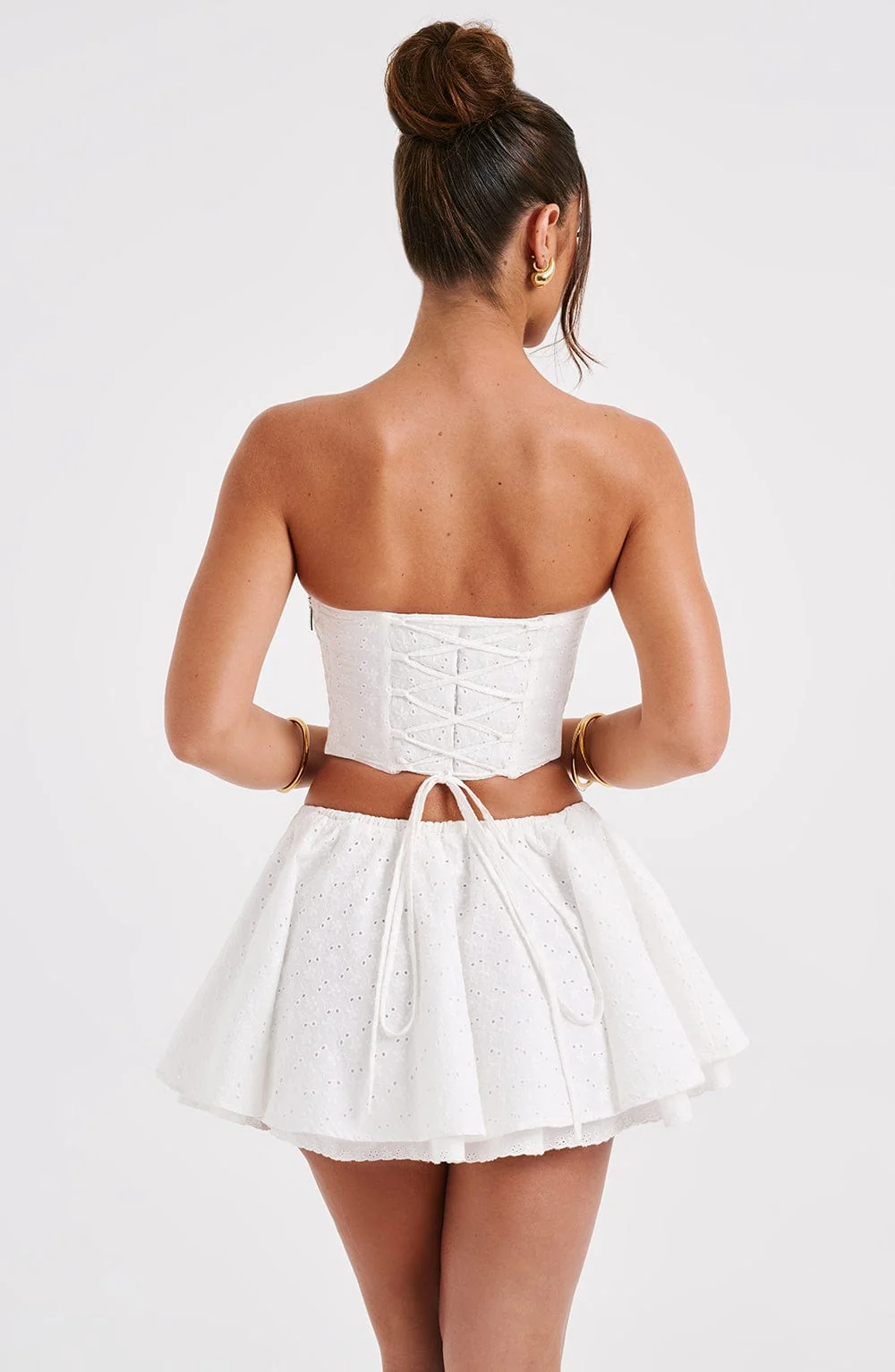 Indulge in the elegance of our Floral Broderie Anglaise Corset Top in Ivory. This figure-hugging top features boning in the bodice, underwired cups, and a lace-up back for a flattering silhouette. Made of premium floral broderie anglaise cotton, fully lined for comfort. Complete your look with the matching Winnie mini skirt and radiant makeup. Perfect for brunch, evening events, festivals, holidays, parties, or any special occasion. Elevate your style with this cropped corset top today!