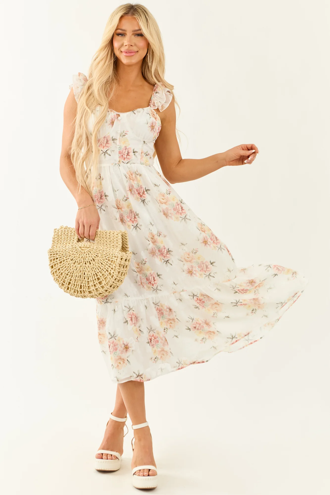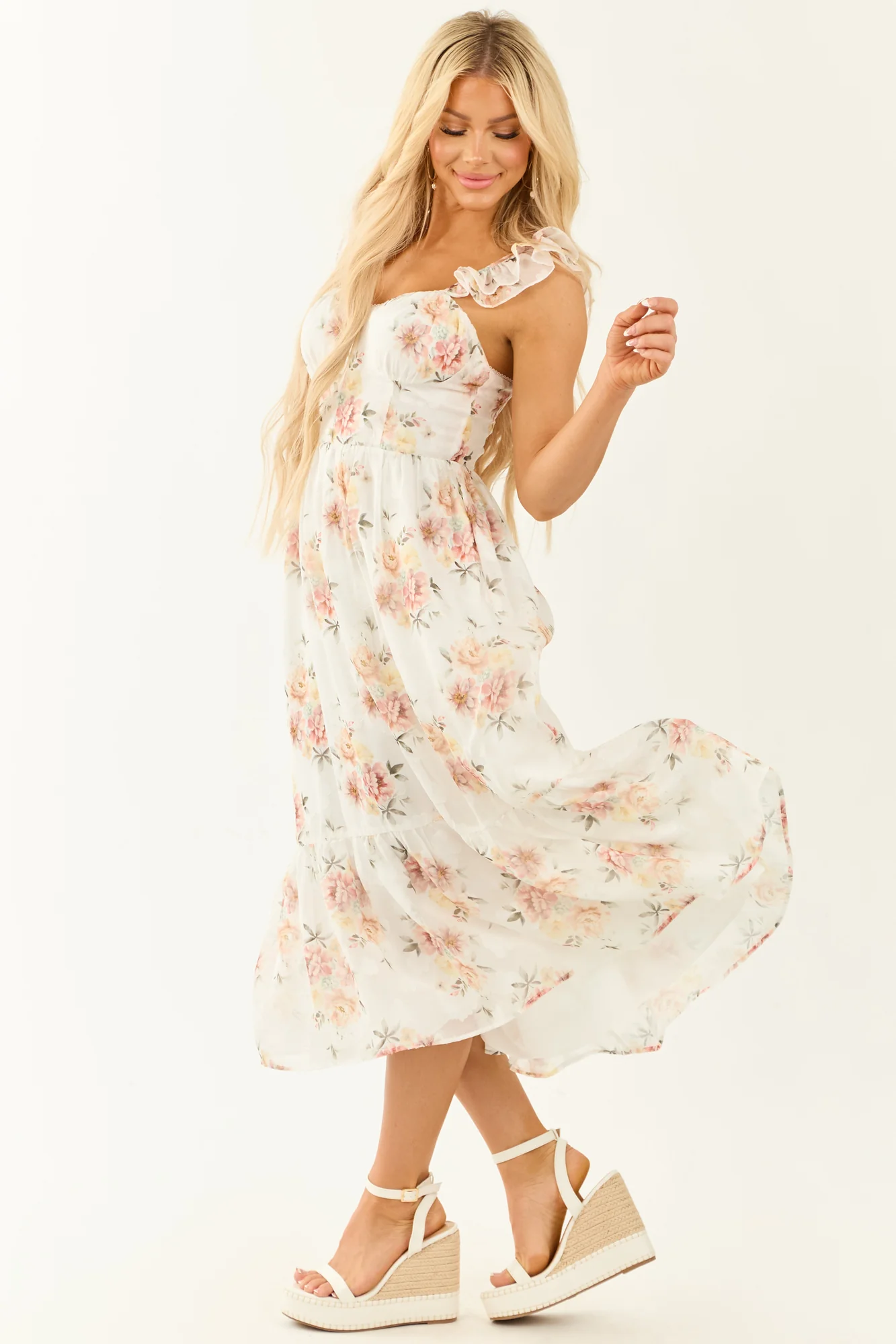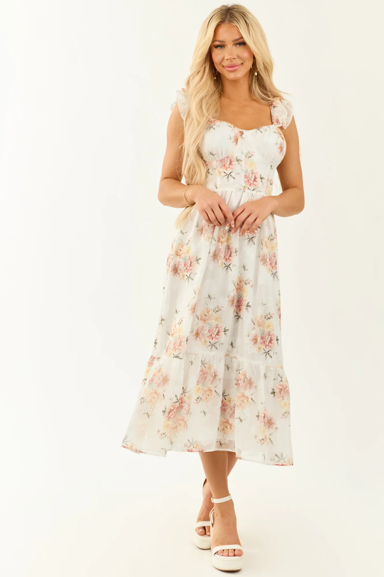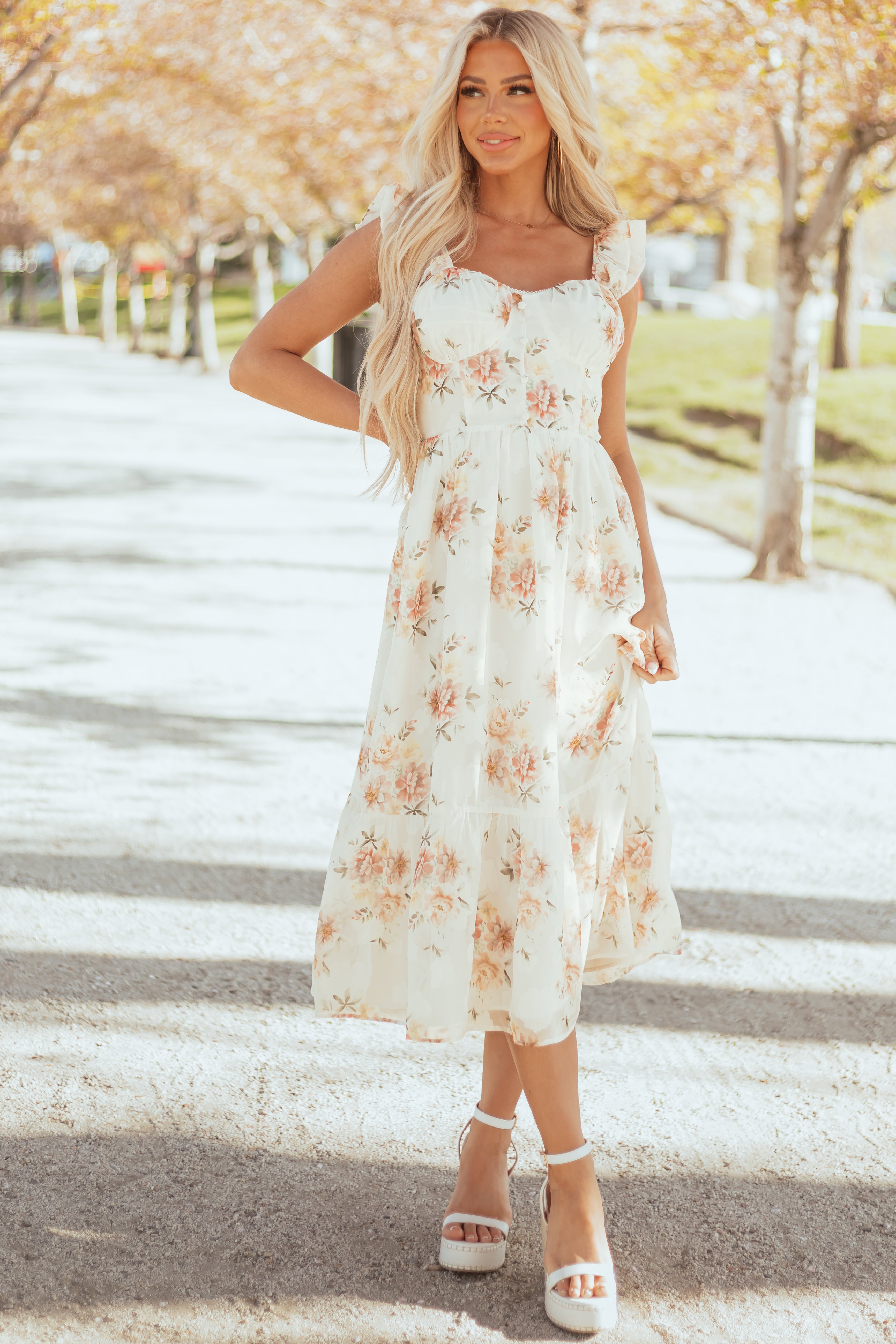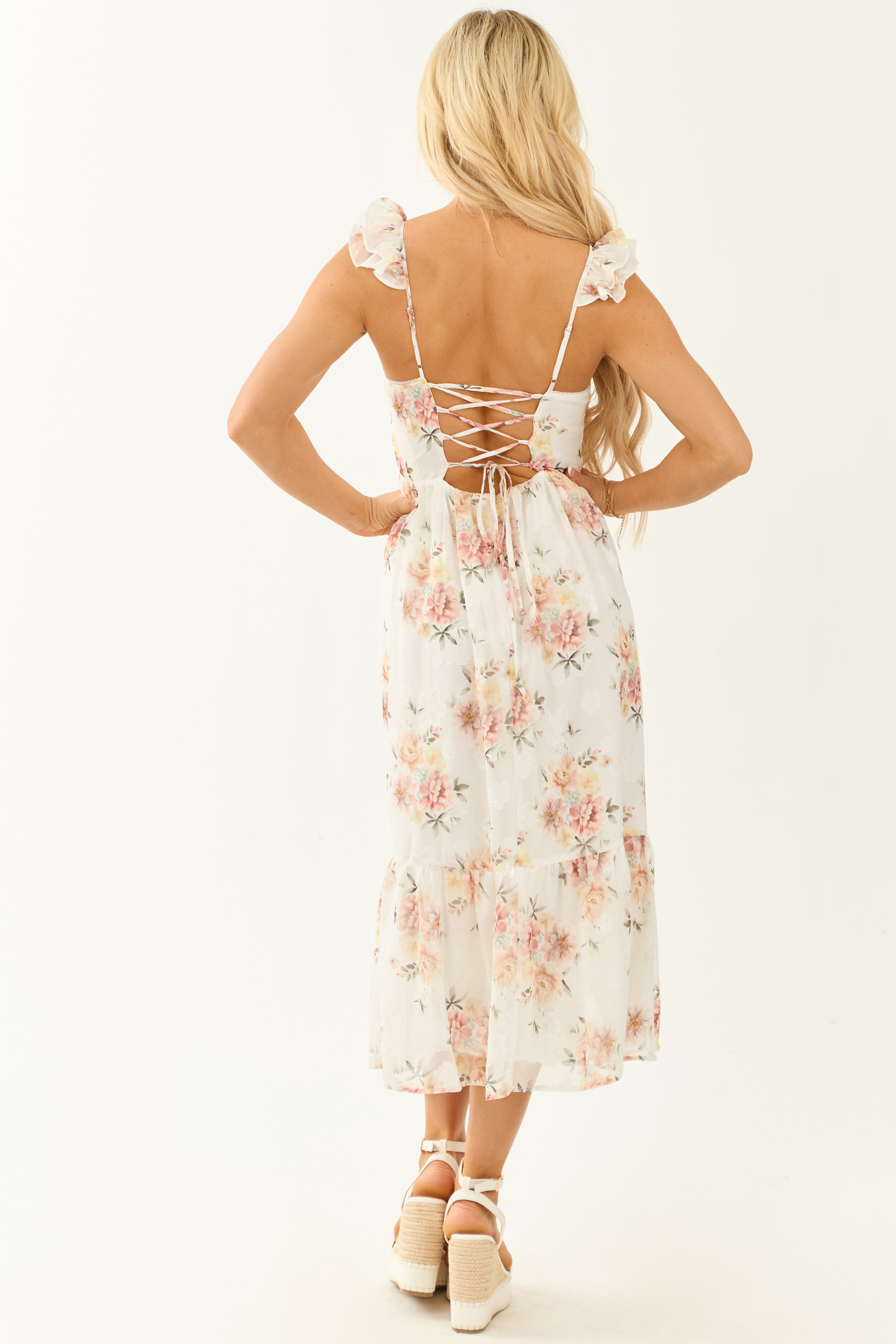 Experience divine beauty with this flowy chiffon midi dress featuring a subtle floral print in shades of Dusty Blush, Tea Rose, Brick, Light Amber, Army Green, Honeysuckle, and Olive. Designed with lace details, tiered ruffle straps, and a lace-up open back, this dress exudes elegance and charm. Made of 100% Polyester with a semi-stretchy lining, it offers both style and comfort. Perfect for special occasions or everyday wear.
