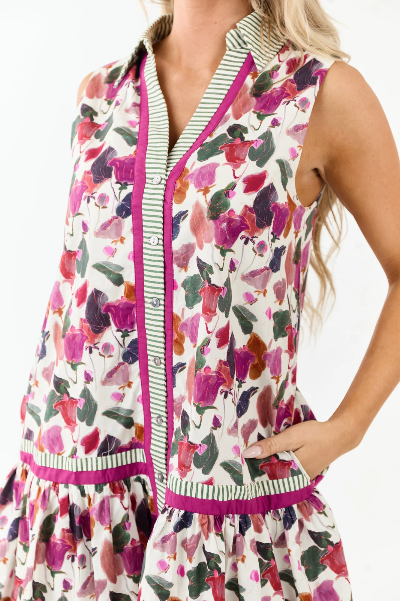 Elevate your style with our floral cotton mini dress showcasing playful contrast stripes. This non-stretchy lightweight dress offers a breezy tent fit for all-day comfort. Bursting with color in Boysenberry, Indigo, Dusty Rose, Tangerine, Sedona, Cranberry, and Forest Green hues. Featuring side pockets, lined with 100% Cotton. Ideal for a casual day out or a fun gathering. Imported.