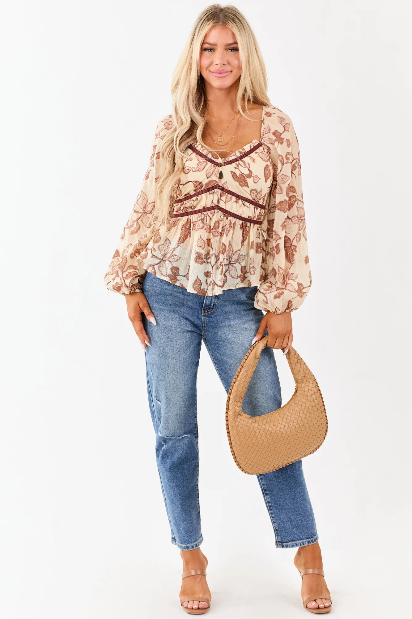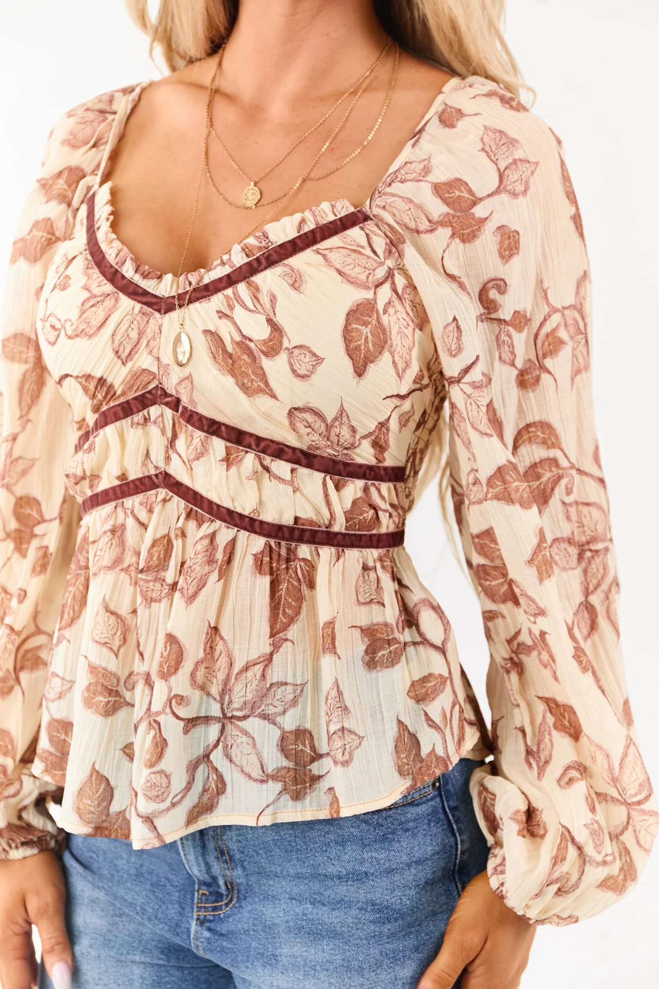 Indulge in the luxurious charm of our Almond Floral Crepe Babydoll Blouse with exquisite velvet trim. Designed for comfort and style, this peasant blouse features a flattering babydoll fit with delicate floral patterns on crepe fabric. The smocked back, velvet accents, and semi-sheer long bubble sleeves add a touch of elegance. Perfect for both casual and dressed-up looks, this blouse is a wardrobe essential. Embrace femininity and grace with this beautifully detailed top.