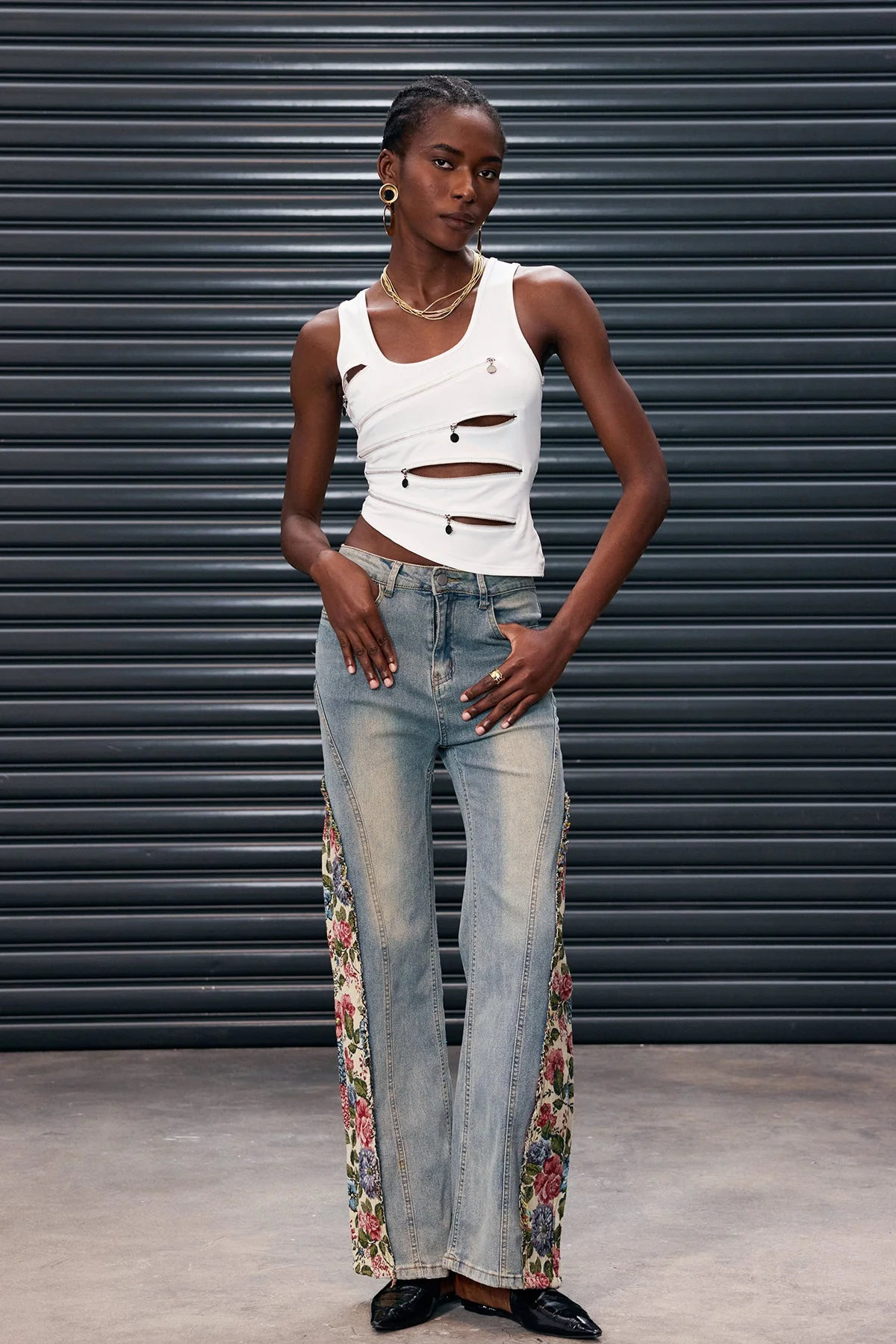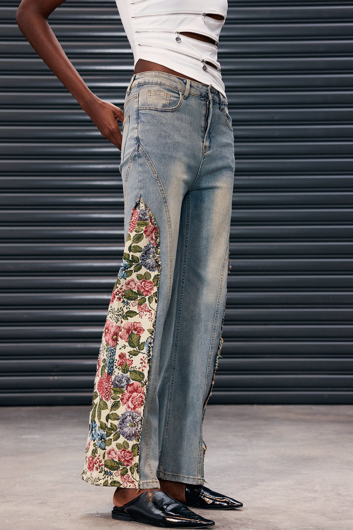 Elevate your denim collection with our Floral Deconstructed Denim Jeans in Blue. These stylish jeans feature a unique deconstructed floral pattern for a bold, fashion-forward look. Crafted from 50% Polyester and 50% Cotton, these jeans offer comfort and durability. Perfect for adding a touch of edgy sophistication to your wardrobe. This non-stretch denim can be gently machine washed. Please note, the actual color may vary slightly due to lighting differences in images.