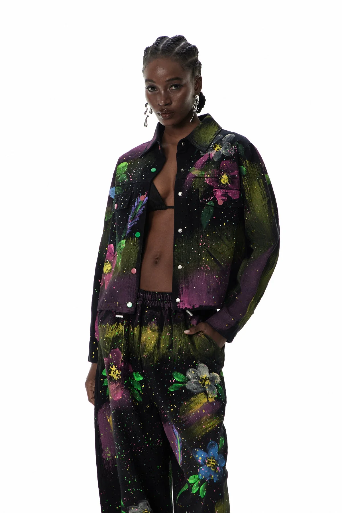 Elevate your casual wardrobe with the Floral Denim Jacket featuring avant-garde street art motifs blended with classic florals. Crafted from premium denim for durability, this jacket boasts intricate graffiti-inspired designs for a bold yet refined statement piece. Experience a structured fit with contemporary edge and timeless style in this artfully crafted jacket that offers expert craftsmanship. Ideal for those seeking artistic flair and unique urban edge in their outfits. Please note that color may vary slightly due to lighting. This jacket does not stretch and can be gently machine washed for a clean look.