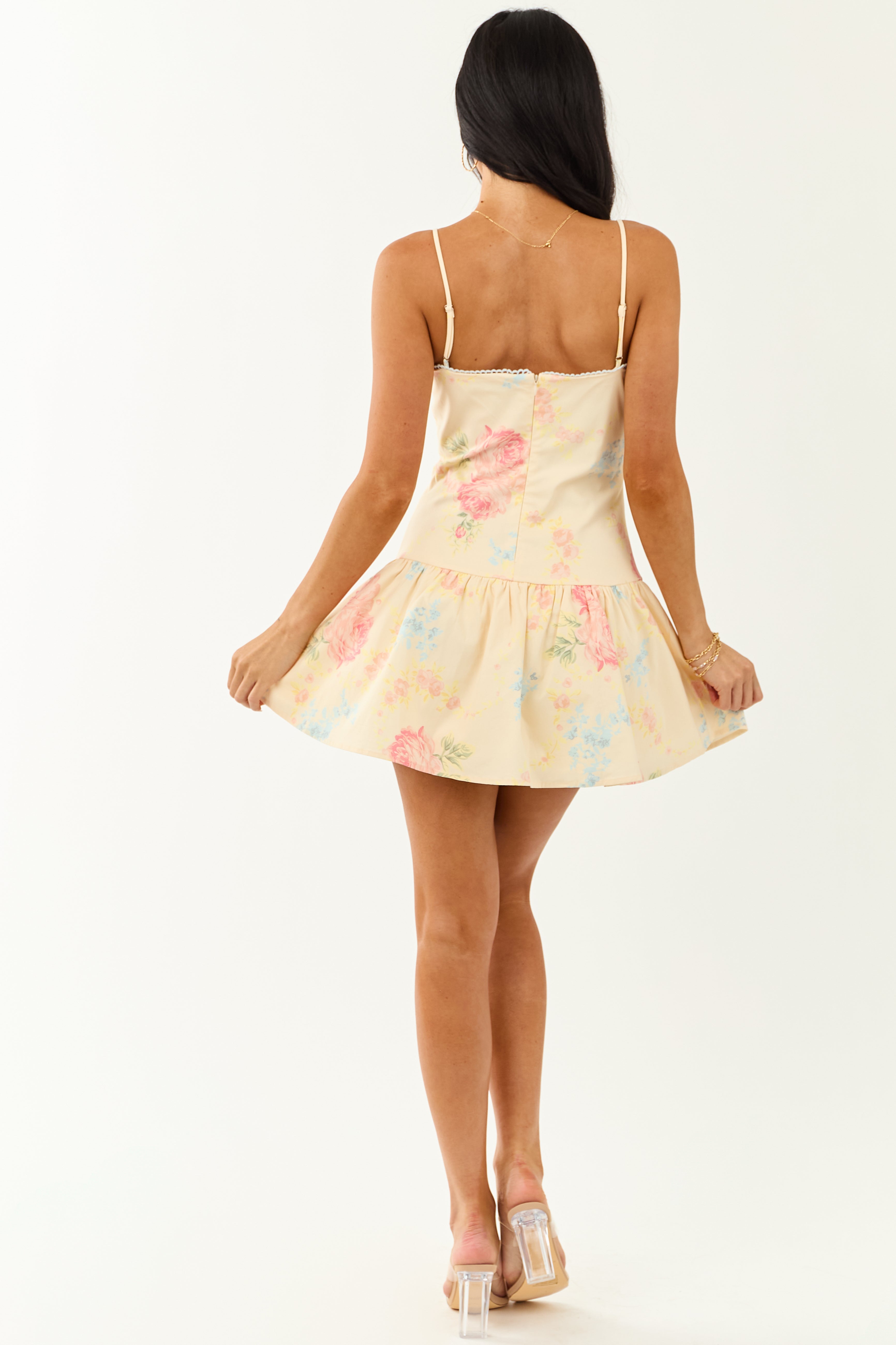 Indulge in the sunshine with our charming Floral Drop Waist Mini Dress in pastel yellow. Designed with adjustable spaghetti straps, a sweetheart neckline, and a ruffle hem. Made of semi-stretchy cotton blend fabric with a jungle green, punch, watermelon, and sunshine pattern. Features open scallop lace trim, hidden back zipper, and is lined for comfort. Available in sizes S, M, and L. Model is 59″ tall, wearing a size Small.