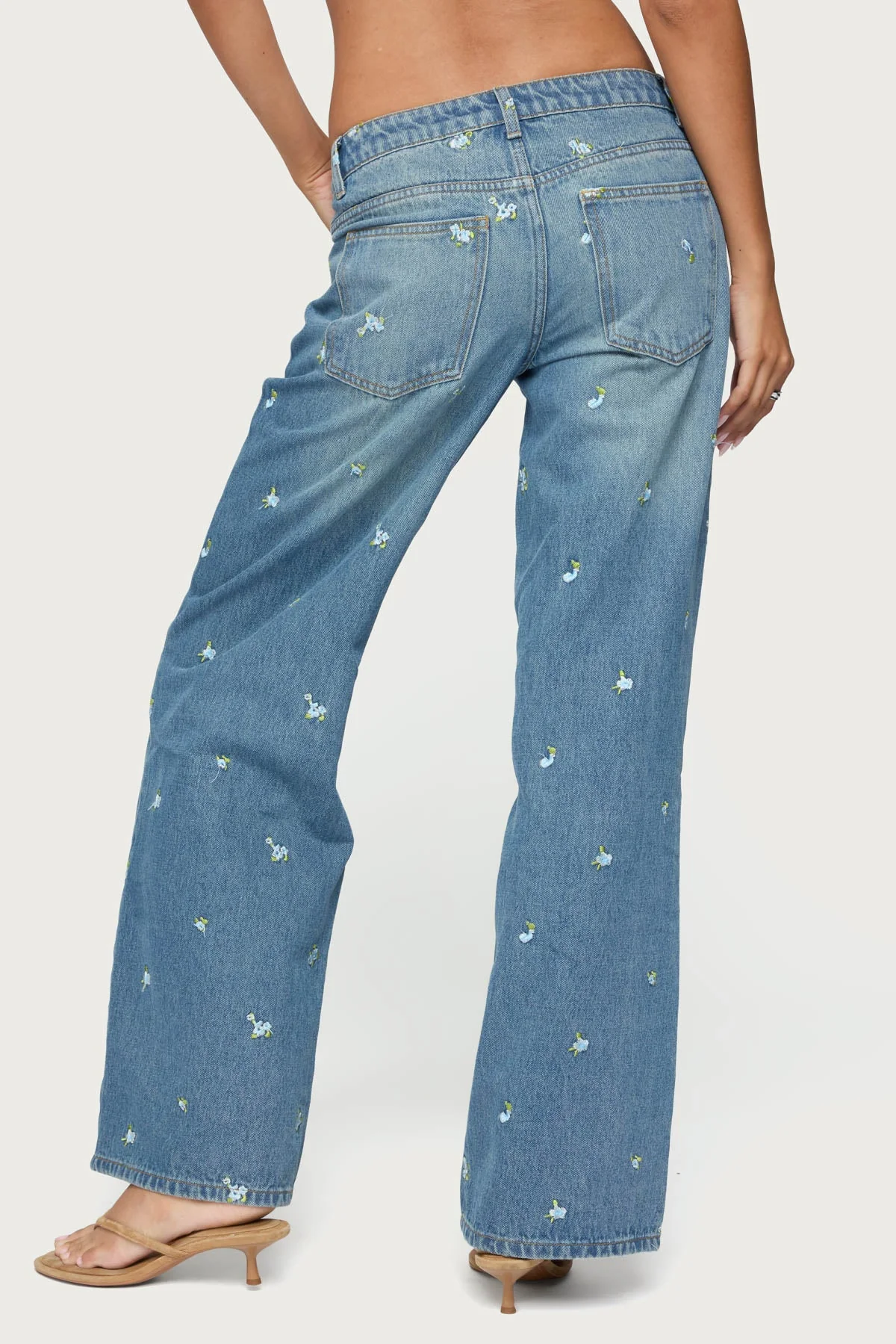 Discover the stylish appeal of our Blue Washed Floral Embroidered Low Rise Denim Jeans, featuring a flattering low-rise waist, a sleek straight leg fit, and intricate floral detailing. Crafted from 100% Cotton denim fabric for ultimate comfort and durability. Available in sizes XS, S, M, L, and XL. Elevate your wardrobe with this versatile denim staple. Model wears size S with an inseam of 31.5 inches and a height of 59. Care instructions: Machine wash cold (max 30ºC), non-chlorine bleach when needed, tumble dry low, iron at a moderate temperature (max 110ºC), do not dry clean.