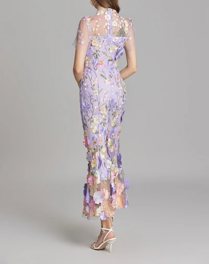 Indulge in elegance with our Floral Embroidered Mesh Fishtail Midi Dress. Adorned with intricate floral details on sheer mesh, this dress boasts a luxurious fitted silhouette and a graceful fishtail hem. Perfect for special occasions, this dress is a true statement of sophistication and charm. The color variation in the product images is due to lighting. Our dress is true to size, designed to fit based on our size chart. Avoid sizing up or down for the perfect fit.