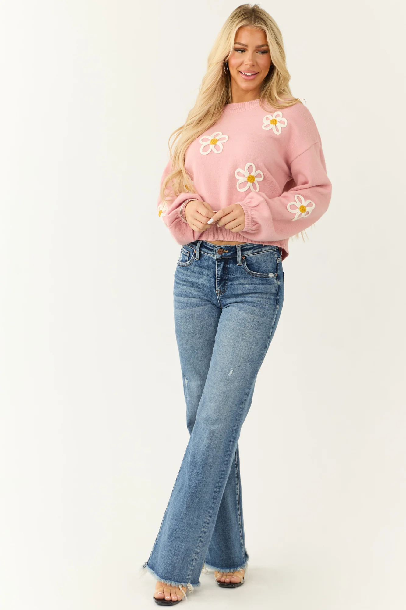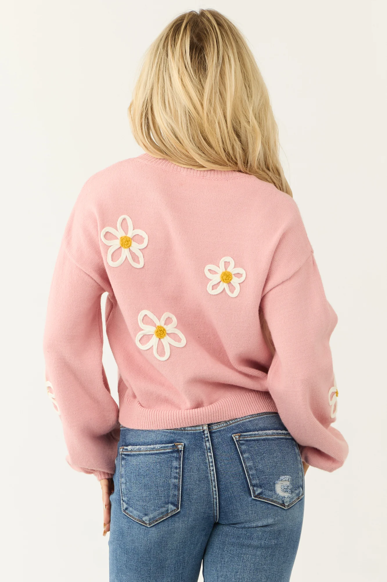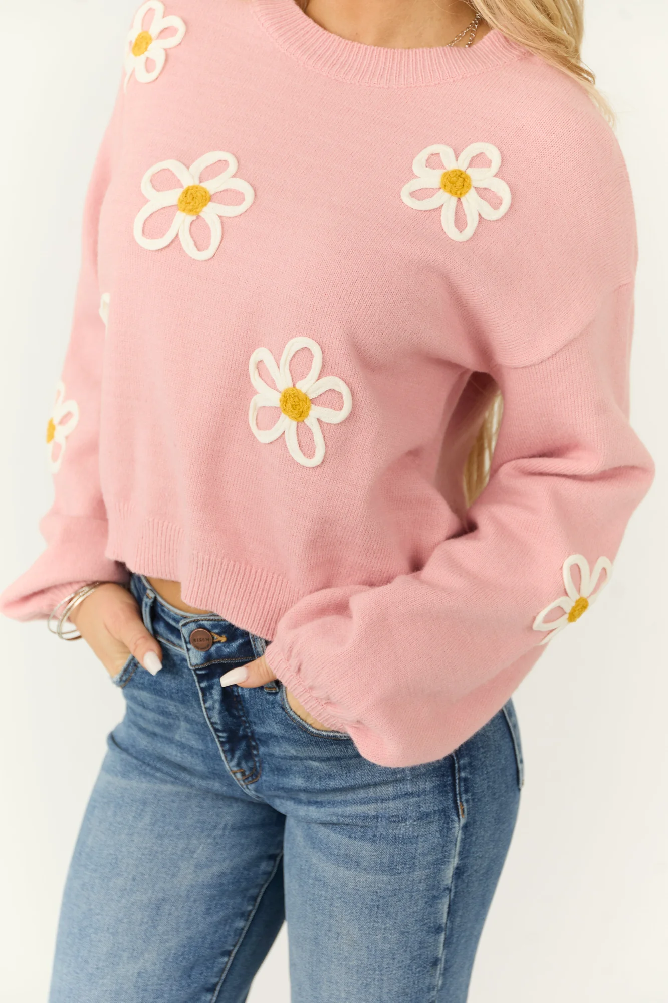 Stay stylish and snug with our Floral Embroidered Puff Sleeve Sweater in Carnation, Off White, and Amber hues. Crafted from a stretchy ribbed knit blend with intricate floral thread detailing. This drop shoulder sweater features a crew neck, long sleeves, and ribbed trim for a cozy fit. Perfect for day or night, this sweater is a must-have addition to your wardrobe. Hand wash cold, lay flat to dry. Available in sizes S, M, and L.