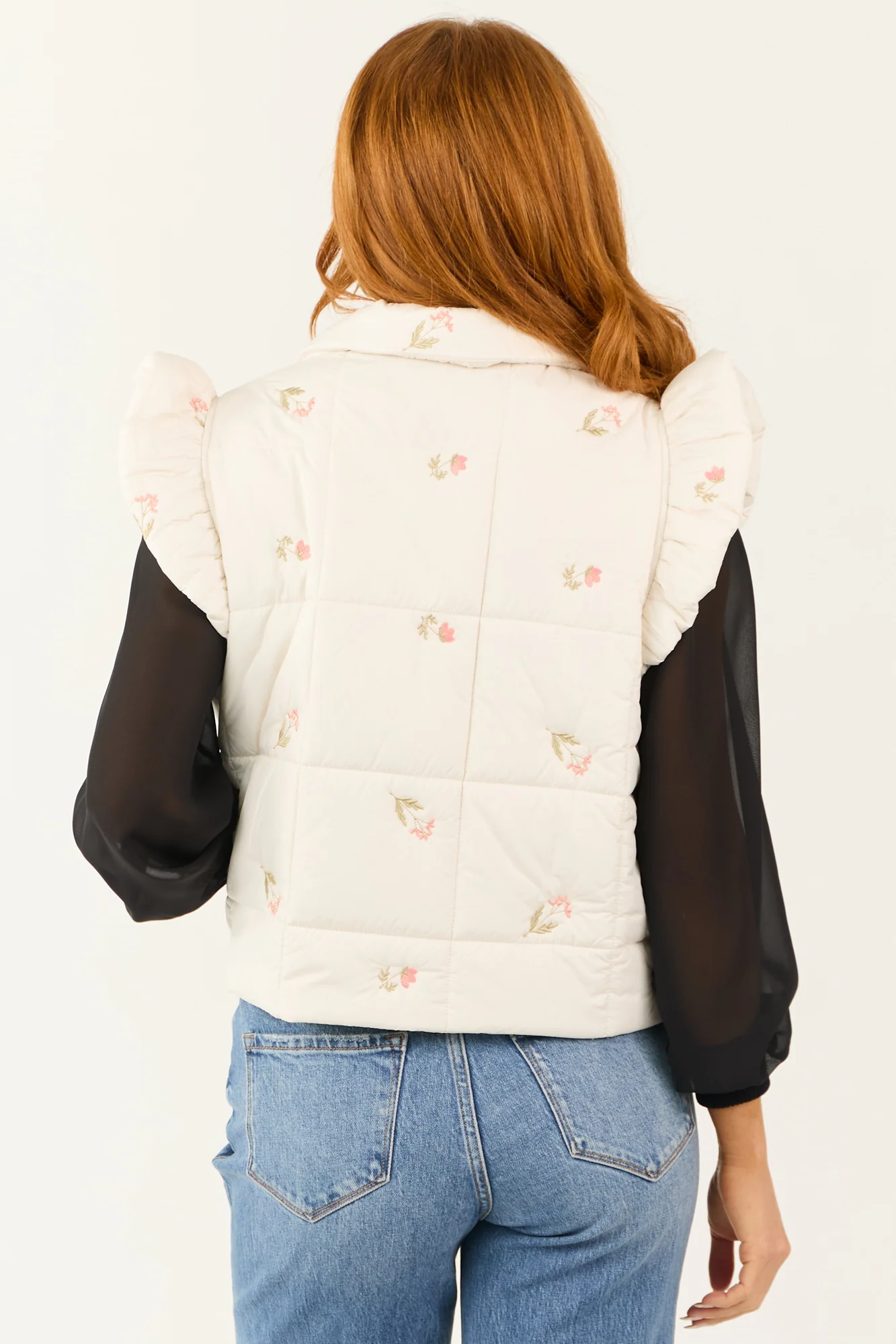 Achieve a charming look with our Vanilla Floral Embroidered Ruffle Vest made from non-stretchy woven fabric featuring beautiful Embroidery in shades of Punch and Olive. This stylish vest boasts a flattering Cap sleeve design, Button-up front, Collared neckline, and Lined interior for all-day comfort. Crafted from 100% Polyester, it offers a perfect blend of style and durability. Ideal for casual or daytime occasions during Fall and Winter seasons. Available in sizes S, M, and L. Hand wash cold, line dry, iron low. Model is wearing a size Small. Model’s Profile: Size 1, Height 55″, Bust 33″, Waist 24″