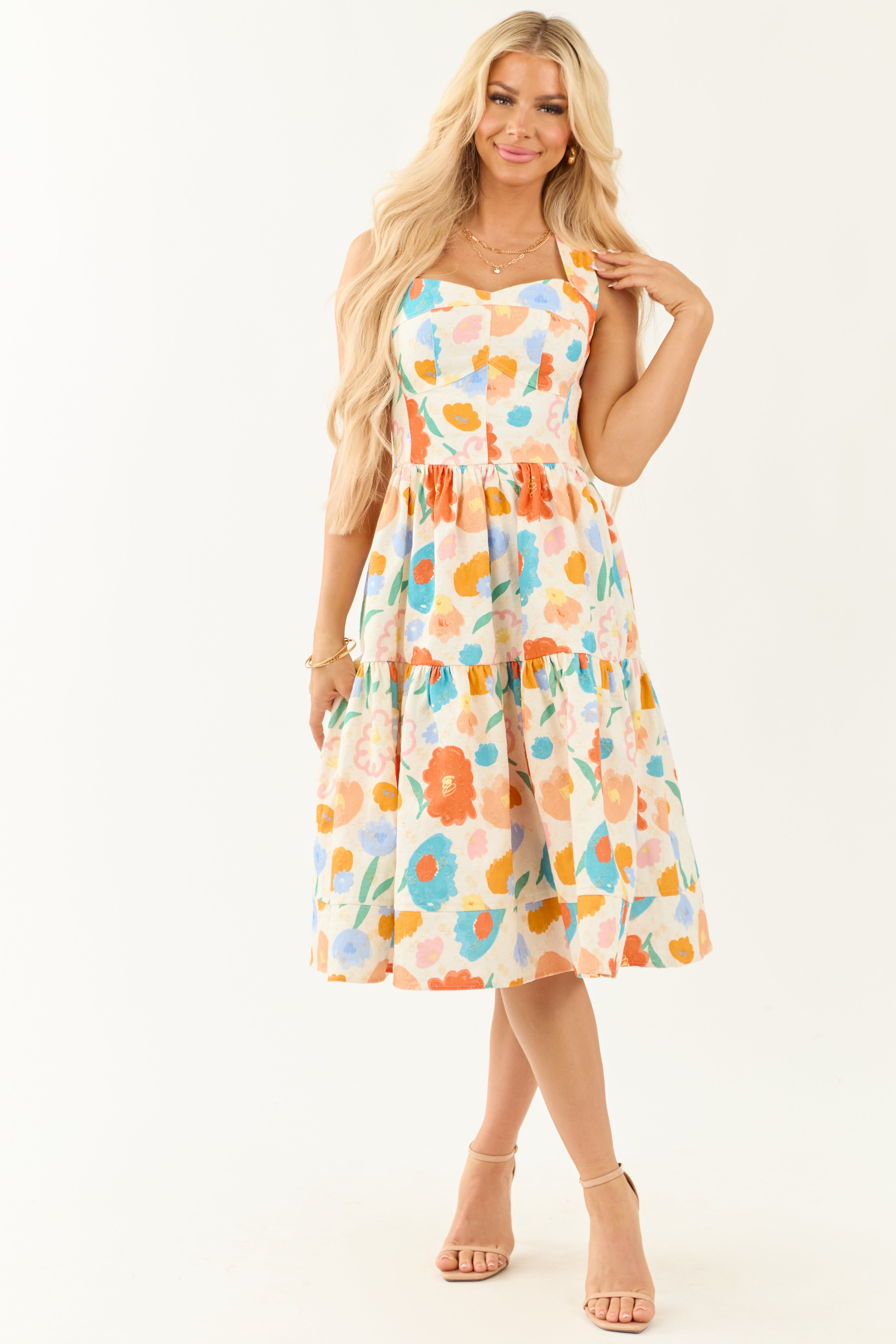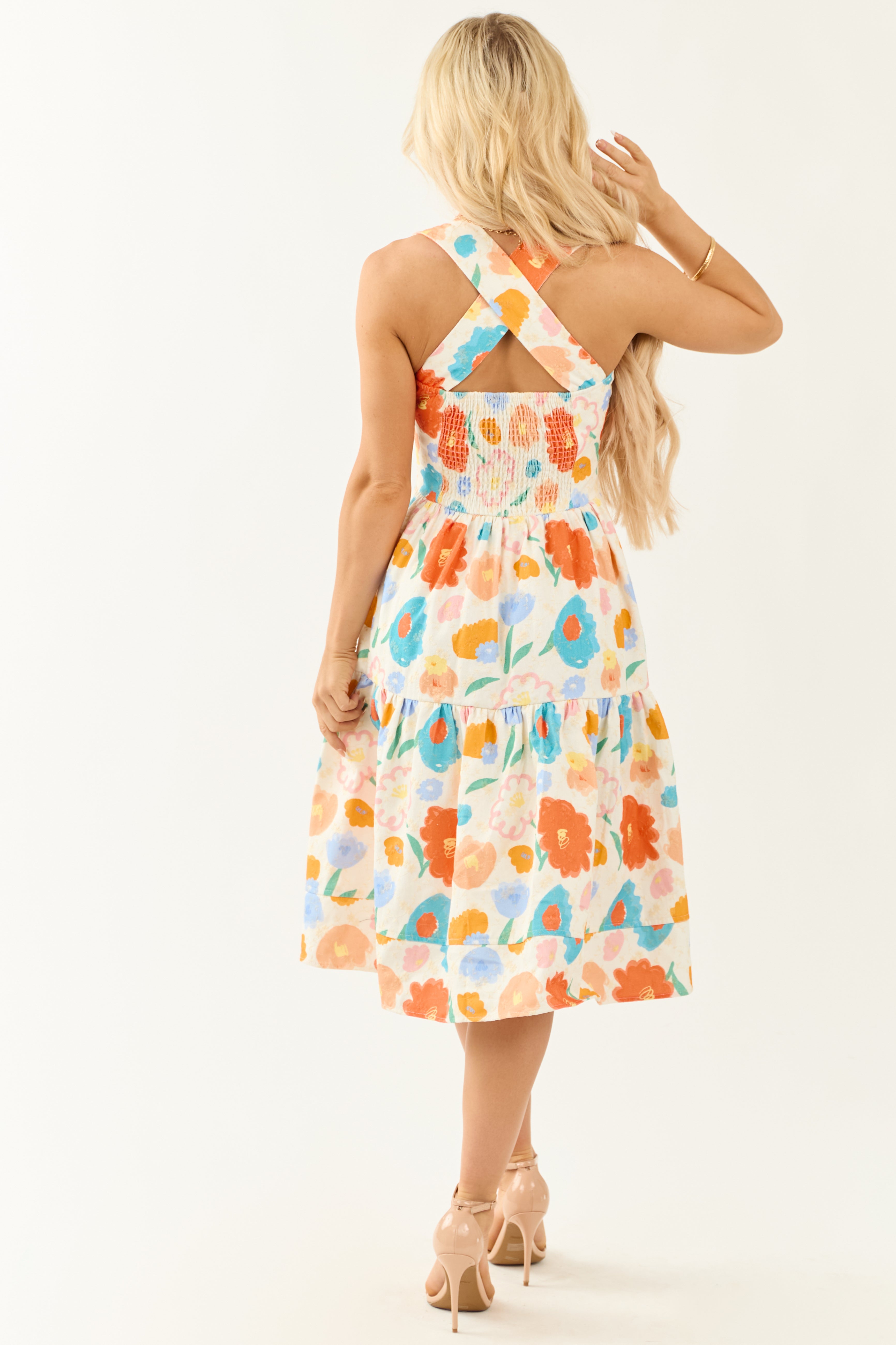 Elevate your style with our stunning sleeveless midi dress featuring colorful floral embroidery in Cream, Amber, Periwinkle, and more. This dress offers a perfect fit with smocked elastic back and a ruched tiered skirt. The sweetheart neckline and criss-cross back add a touch of charm. Made of 100% Cotton, this dress ensures comfort and style all day long. Ideal for Spring or Summer, pair it with your favorite accessories for a complete look. Available sizes: S (2-4), M (6-8), L (10-12). Model height: 57″ wearing size Small.